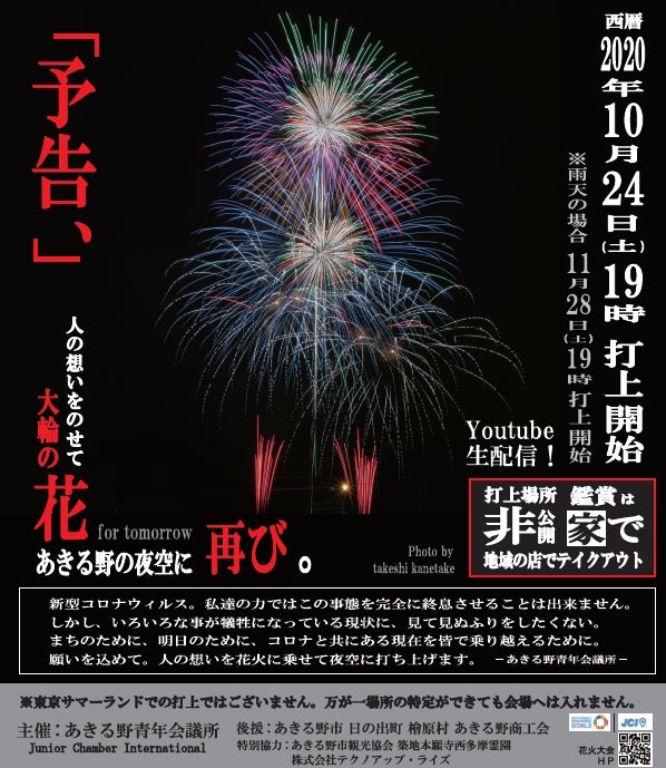 しかし、そんな状況だからこそ、私たちあきる野青年会議所は、地域の為に、明日の為に、コロナを乗り越える為に、希望の花火を打ち上げたい!と、運動を展開致します!
