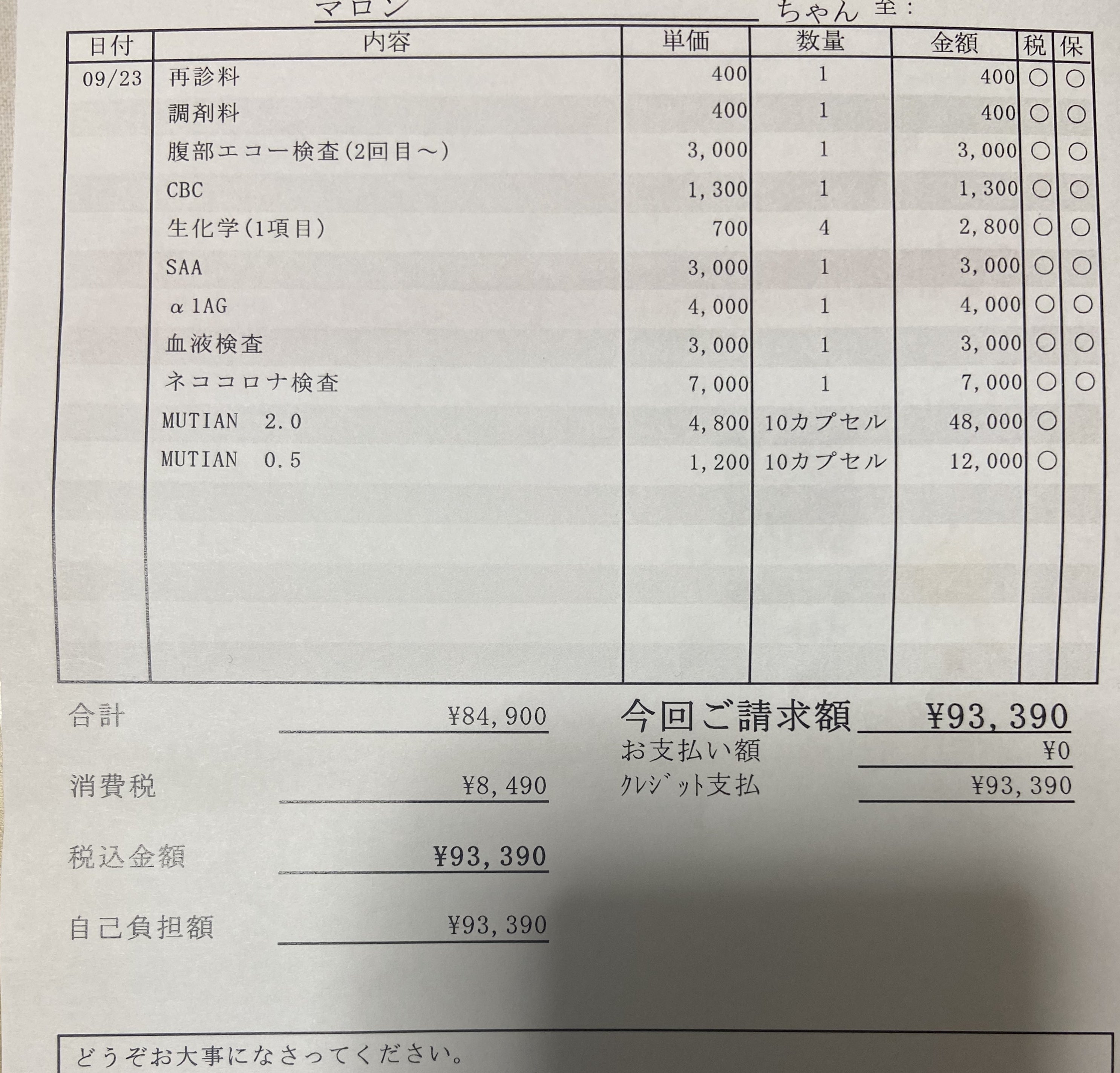 9/23(水)の通院でかかった費用は