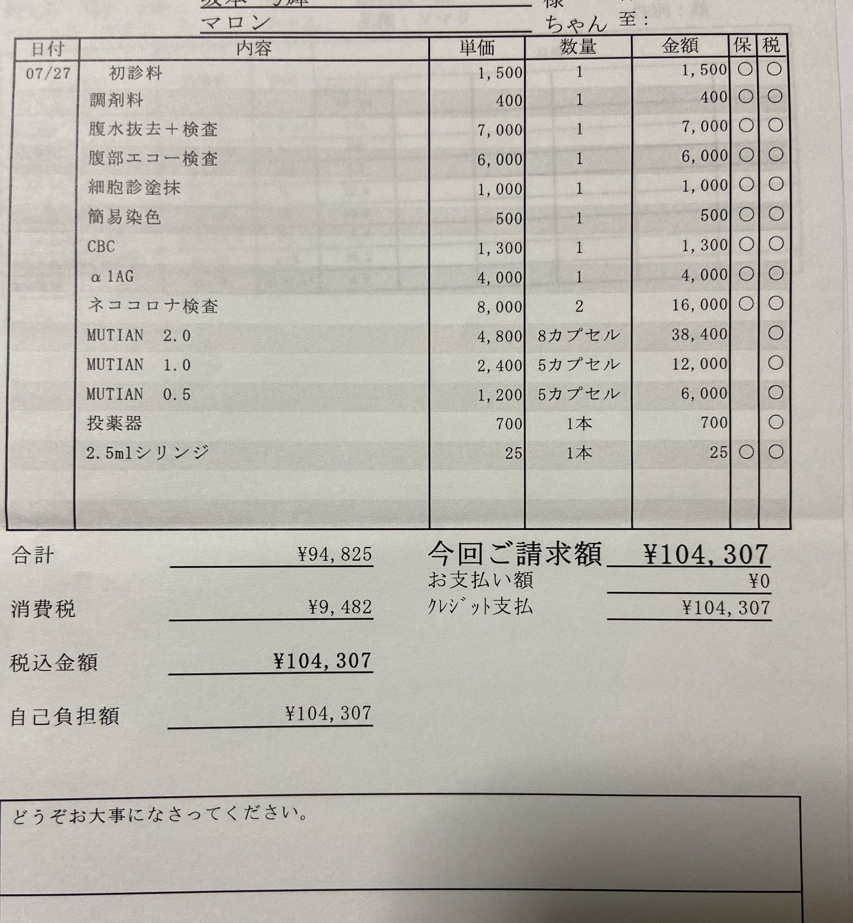 腹水抜去、腹水検査、7000円