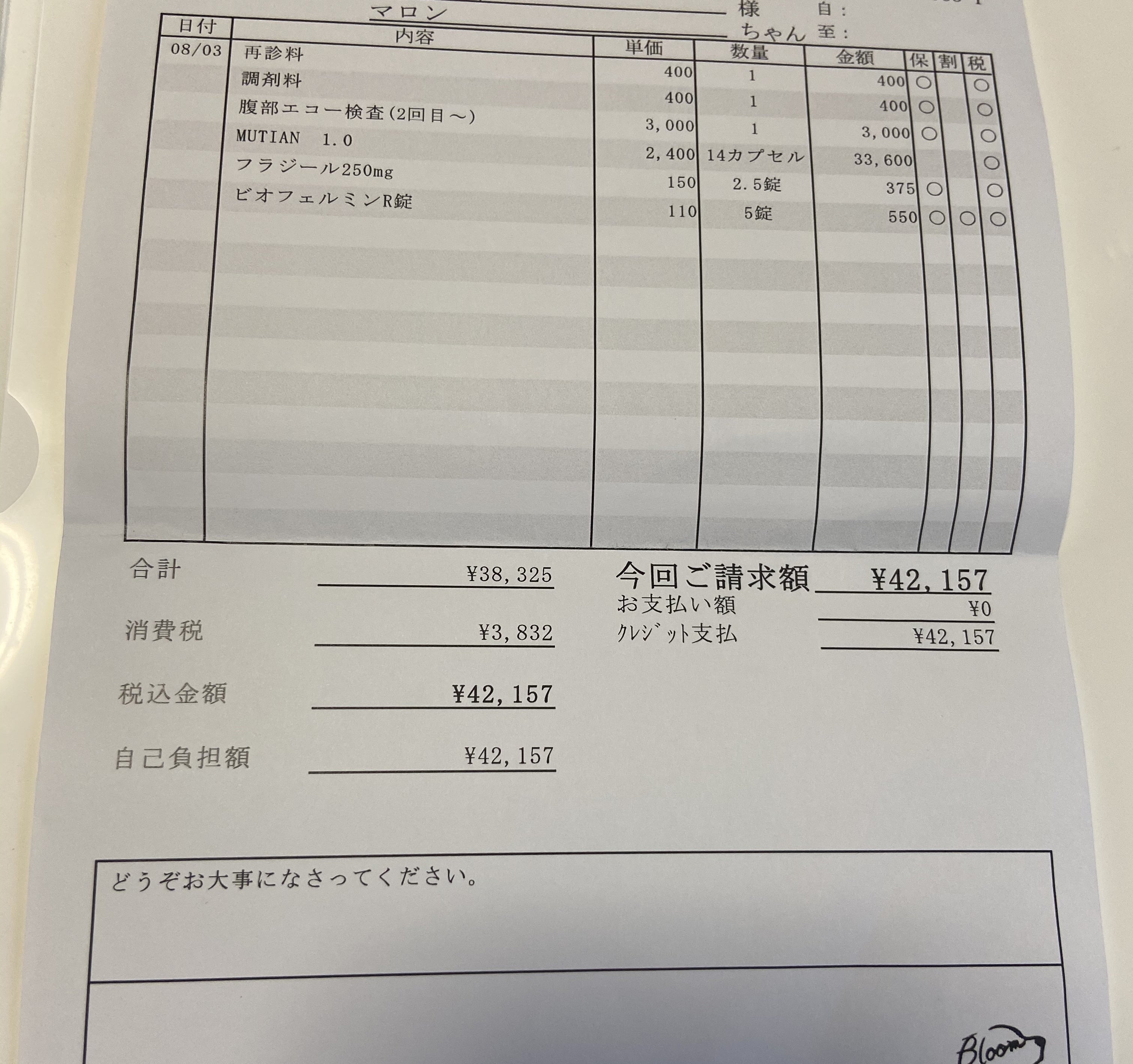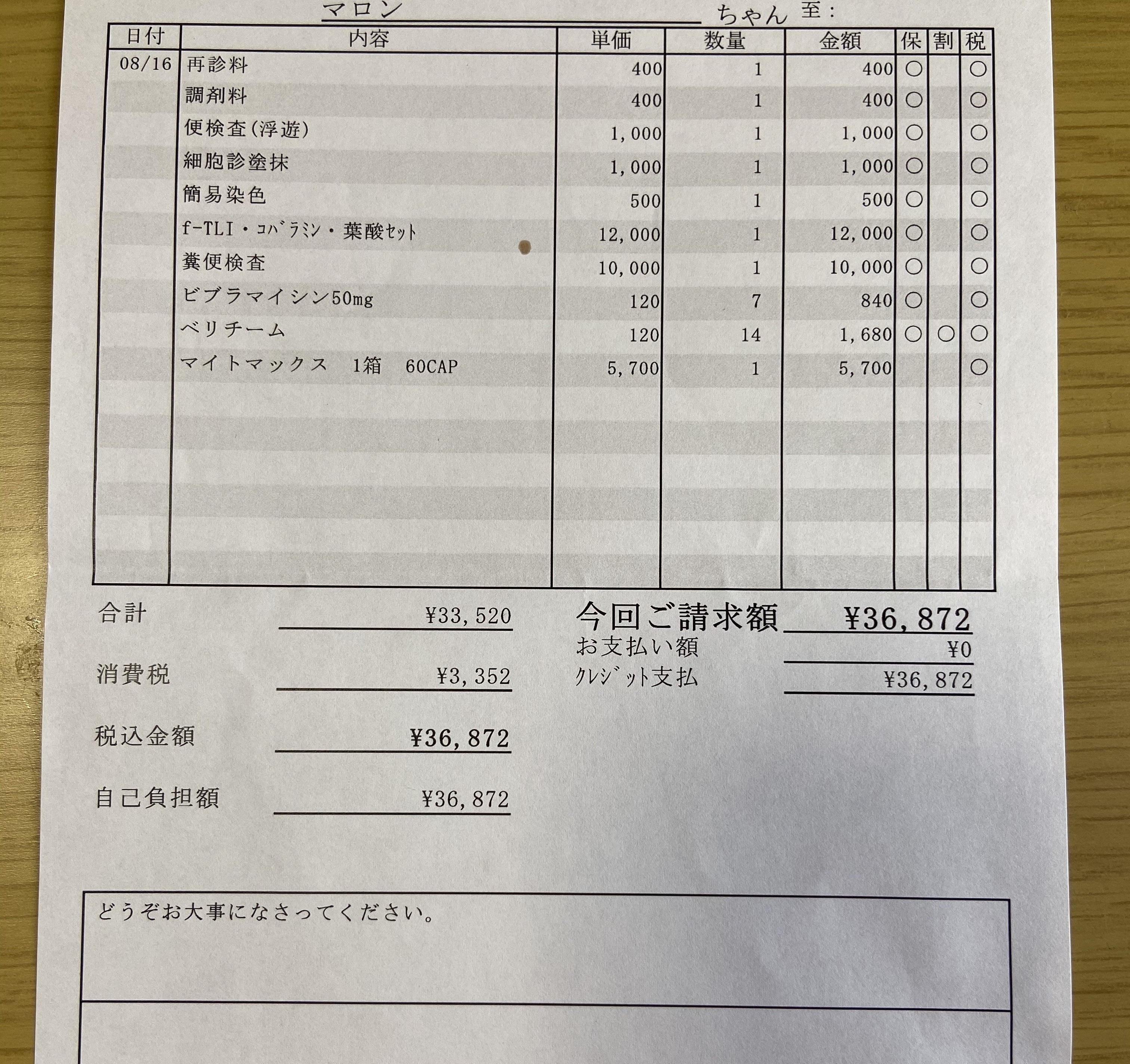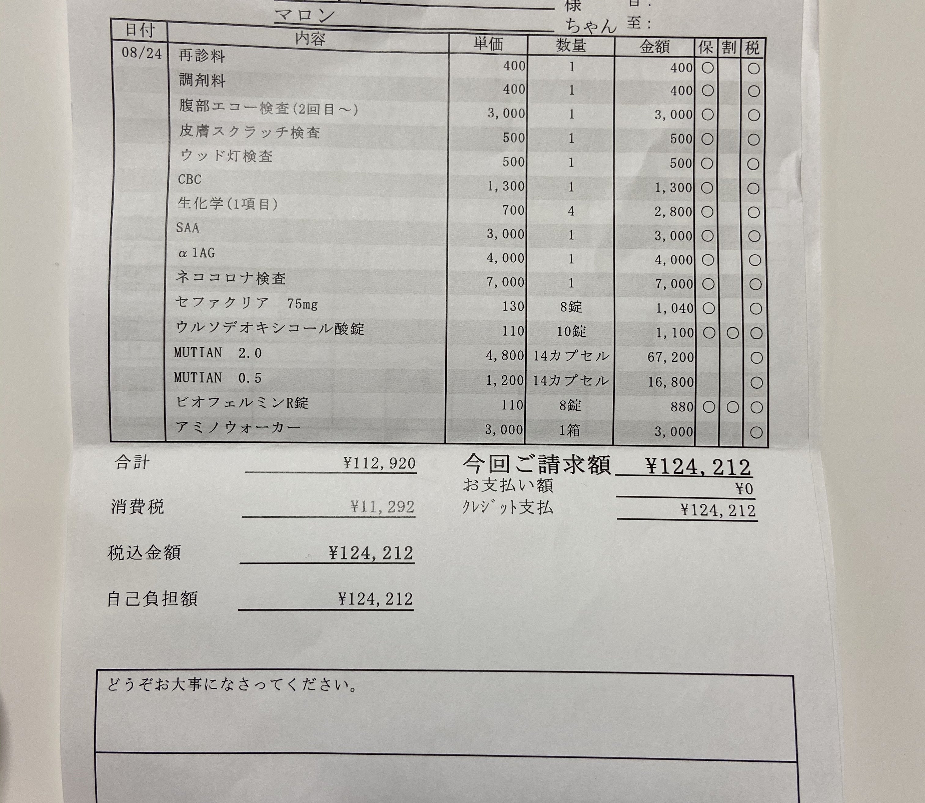 8/24(月)の通院でかかった費用は