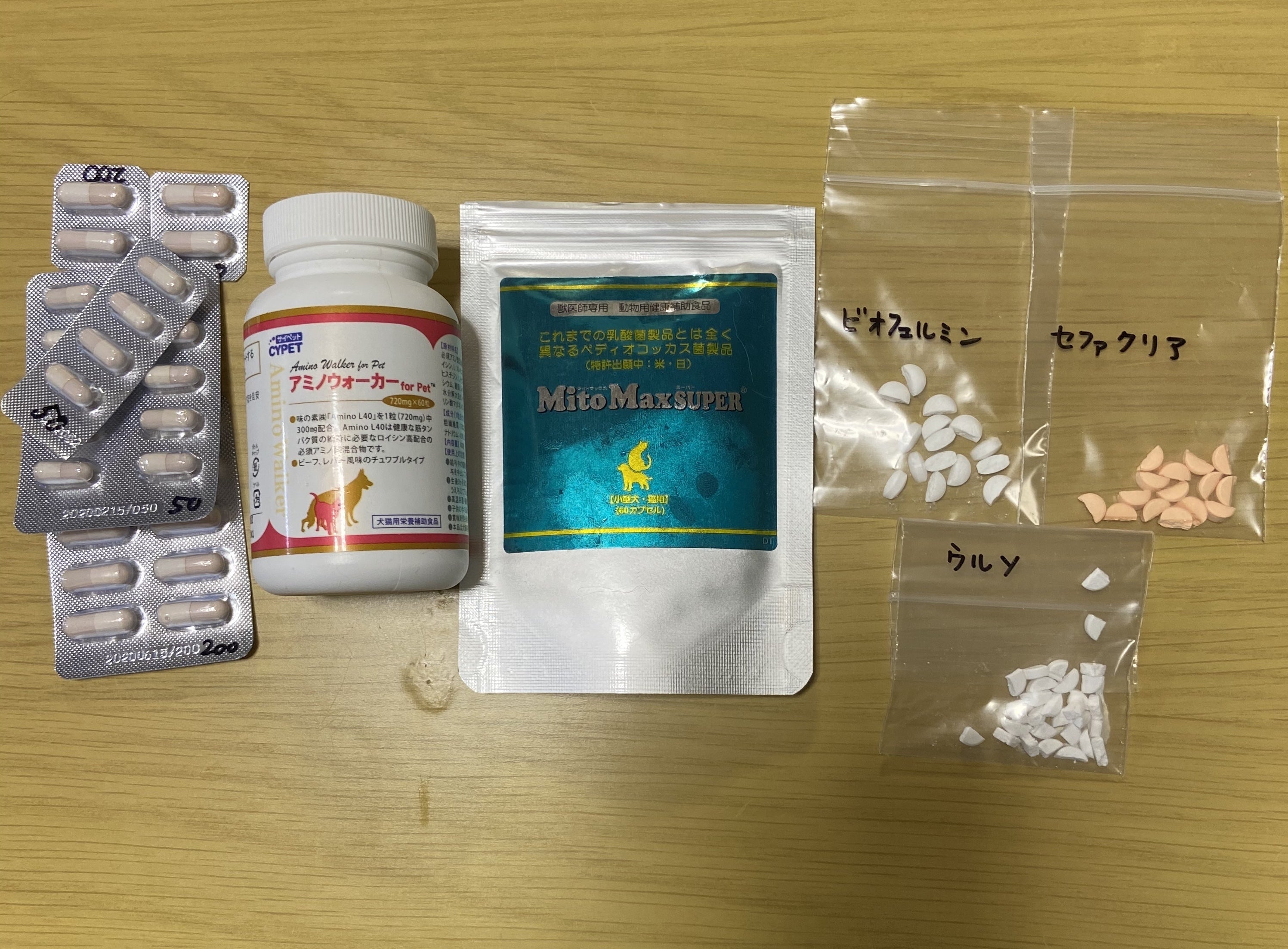 左からMUTIAN、アミノウォーカー、マイトマックススーパー、ビオフェルミン、セファクリア、ウルソデオキシコール酸錠です。
