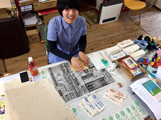 オフィスの看板娘まなみちゃん、バレンでしこしこ栞づくり中!