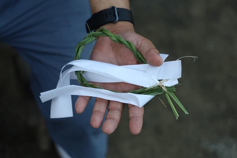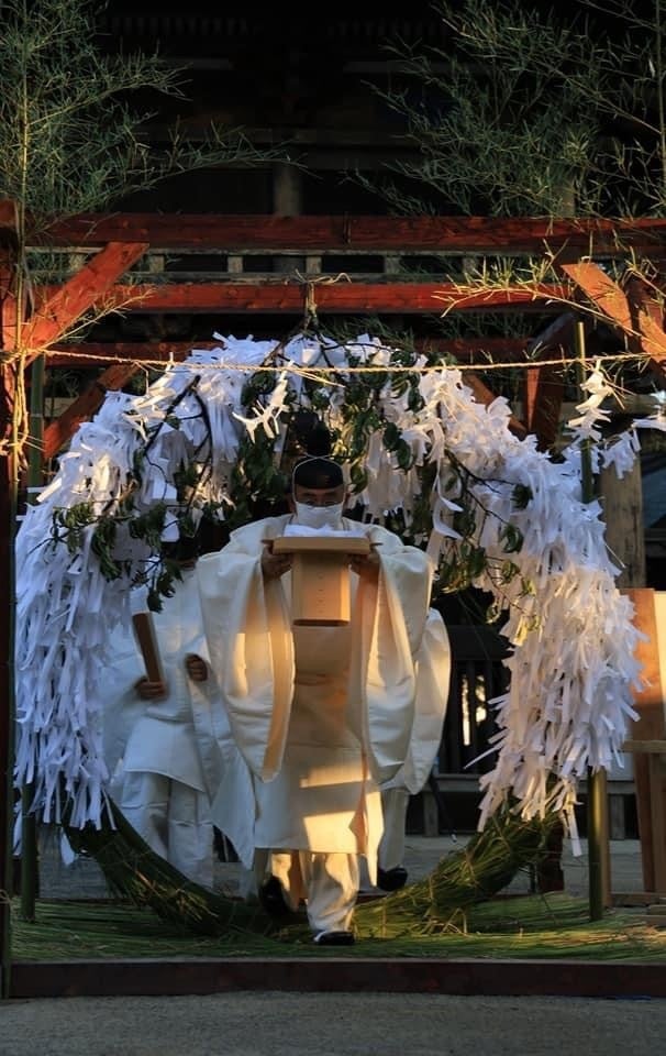 本来であれば、宮司が御神刀を掲げ茅の輪をくぐられます。今回は、コロナ渦で不安な状況、被災され身動きがとれないなど参加したくても出来なかった方、そして温かく見守ってくださる皆さまの身代わりとして人形を宮司が手にされ心を一つにして茅の輪くぐりをされました。来年は、すべてが落ち着き、宮司が再び御神刀を掲げ茅の輪をくぐられる事を願っております。