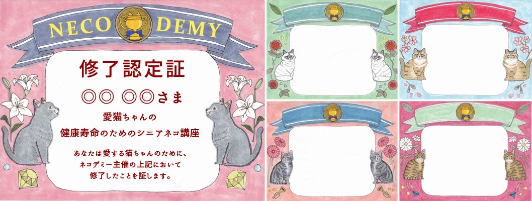 講座を受講いただき、簡易な修了試験に合格した方には、講座の修了証書として絵本作家のpigtaさんのイラストによる「WEBディプロマ(SNSで投稿可 )」を差し上げます(名前は「◎◎ちゃんの飼い主さま」でも可 )! 講座毎に色んなネコちゃん&フラワーのディプロマを展開し、講座を受けるたびにコレクトしていく楽しみ方もできます。