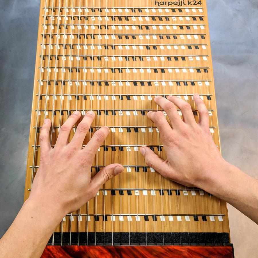 Harpejjiはピアノのような音の配列で、ギターのような弦を、タッピングで演奏します。この仕組みを考えた人は天才だと思います。