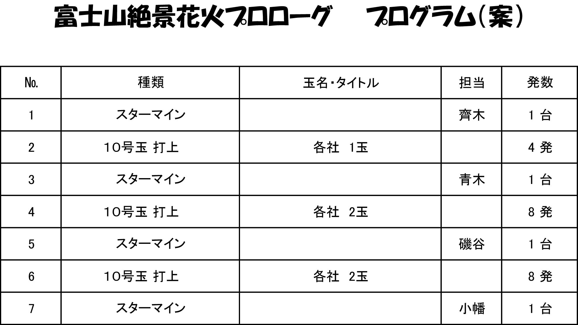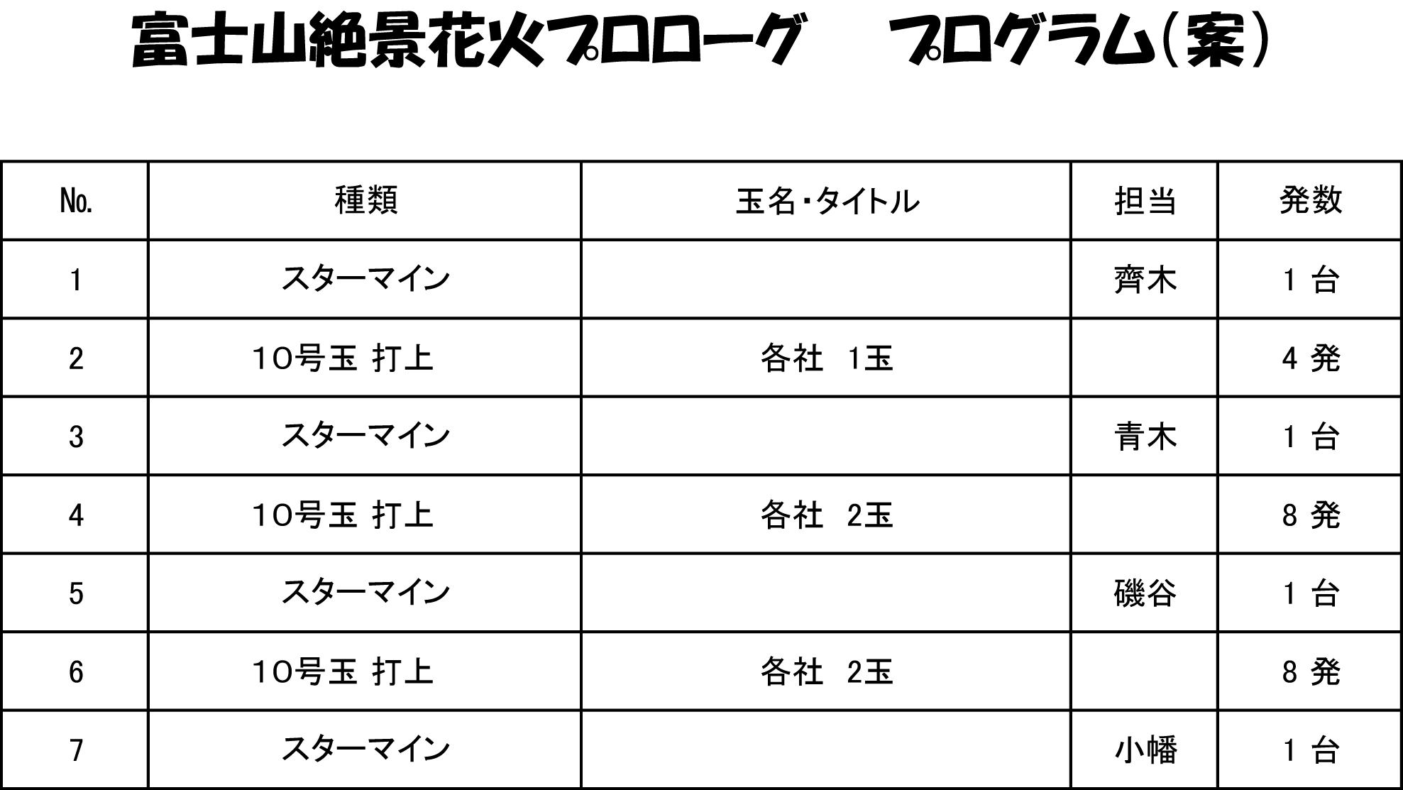 当日のプログラムは、このクラウドファンディングのリターン品であるビック4による尺玉(10号玉)を、各5玉(合計20玉)と、ご支援いただきました金額に応じて、スターマインを増やしていきます。