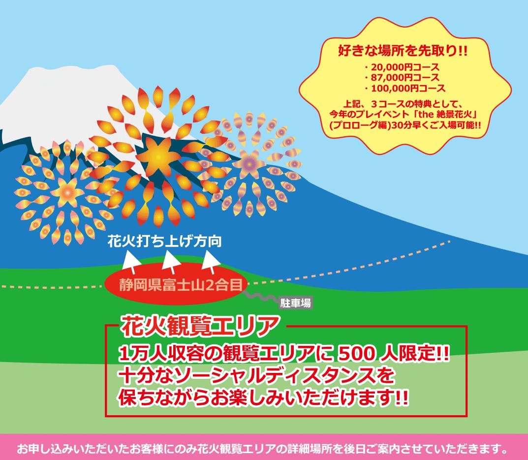 目の前には富士山と花火、富士山の2合目から絶景な景色と花火をご覧いただけます。