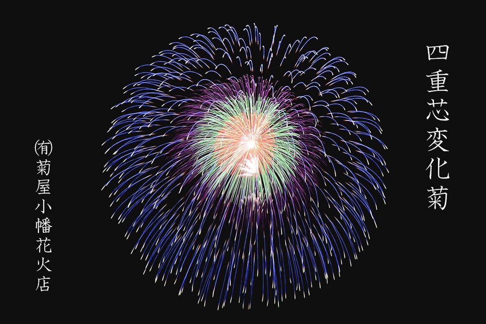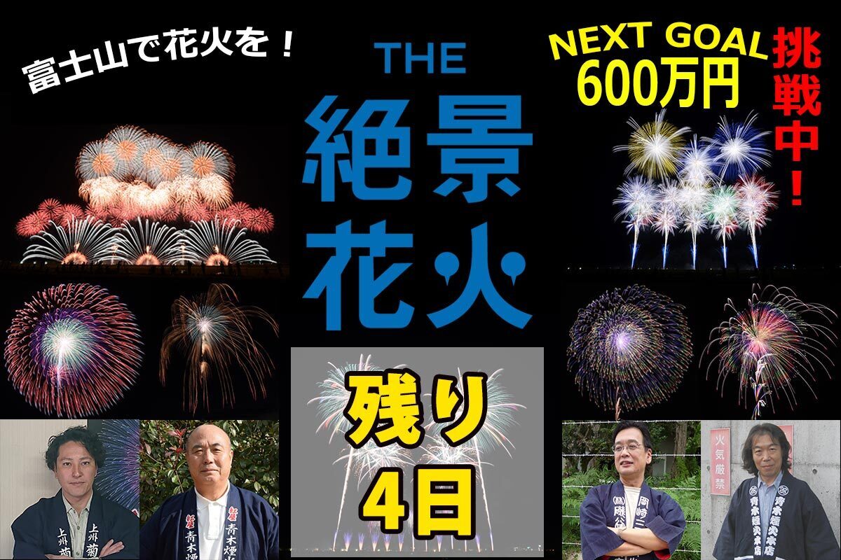 こんにちは。『the絶景花火』実行委員会 煙火担当 菊屋小幡花火店の小幡知明です。お陰様で目標金額を達成することが出来ました。皆様からご支援を頂きまして、心より感謝申し上げます。今回は弊社で打上げ予定の10号玉のご説明させていただきます。「四重芯菊先紫銀乱」現代の名工であった先代が1994年より取り組み完成させた多重芯花火で全体で五重の層に設計された構造となっております。先代より引き継がれた真円を描く花火技術をご覧ください。「モノクロームの金華」2012年から製作を始めたオリジナル作品の一つ目である追悼の想いを込めた「モノクロームの華」に華やかさを足すことで発展した花火です。色火を使用せずに、味わい深い色彩で色褪せることのない華を表現しています。「里山の忘れ柿」2015年から製作を始めた、情景を描いた作品です。雪国の里山などで、収穫されずに放置されたままの柿の木に雪が積もっている切なくも美しい情景。雪景色の中でオレンジに輝く柿の実を表現しております。「天竺牡丹」2016年から製作を始めた、ダリヤやアネモネの様な花をイメージした作品で、大きな花弁が特徴でボリューム感のある花火です。「万葉芯秋の彩り」2019年から製作を始めた、新たな芯のカタチを求め生まれた作品です。多くの木の葉を表現した構造で全体の色彩を秋色で表現しています。説明は以上です、楽しみにお待ちください。引き続き、更なるご支援賜りますようお願い申し上げます。