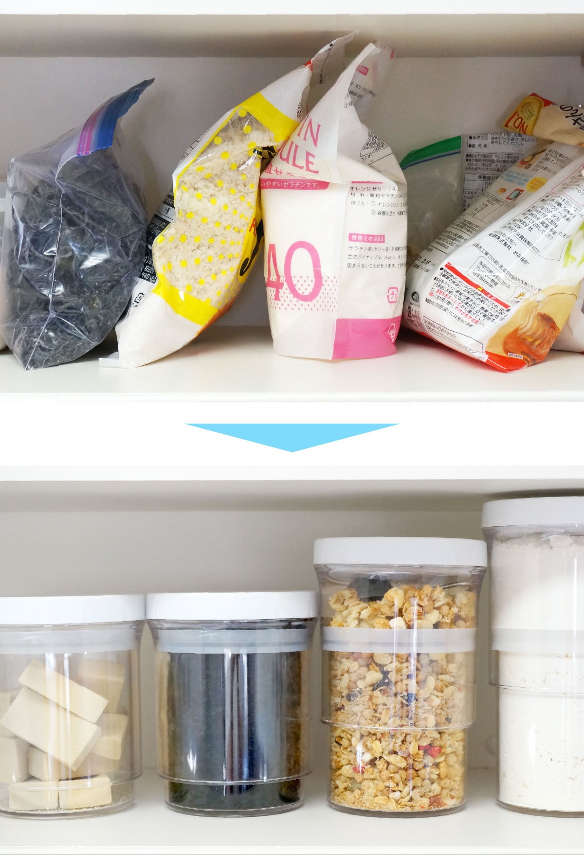 このように食品メーカーは劣化を抑える為に工夫をしているのですが、その食品を使う私たちは限られたスペースにものを置くために、容器に移し替えたりします。