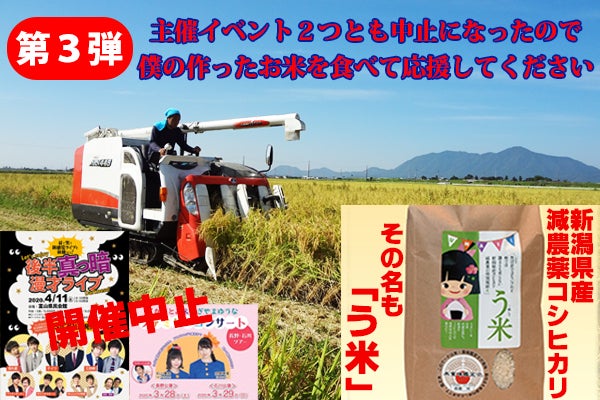 3回にわたって募集をした当クラウドファンディングは今回で最後になりますが、リベンジ公演の資金集めというよりも、「僕の作ったお米を食べて応援してください!」という想いで行いました。ご不安を感じてたりやご不便をされている方に「う米」をお得に食べていただいたり、ひとり親家庭を支援していただいたりして、僕も生き延びてリベンジ開催を目指す。そんな「お互いに励まし合えるクラウドファンディング」にしたいと思っています。