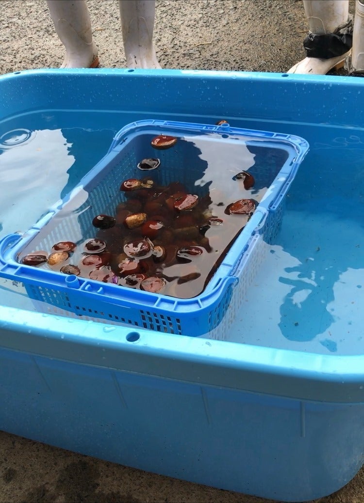 小さなプールに栗を入れ、浮いた栗は取り除き沈んだデンプンがしっかり詰まった重たいものだけをまず最初に選びます。
