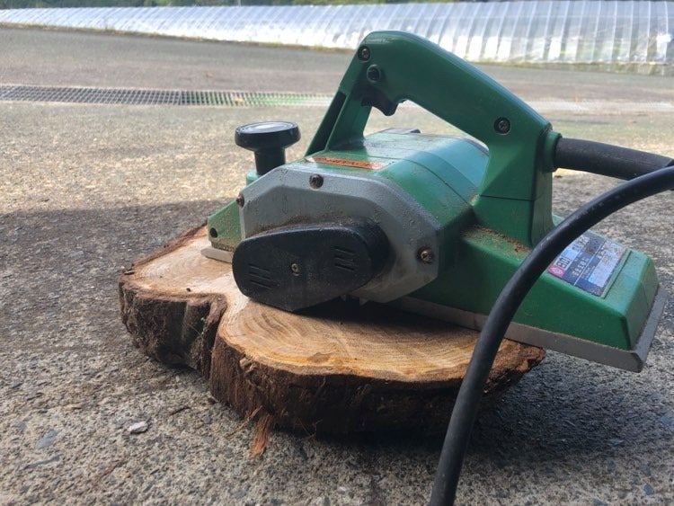 改植した園地の栗の木をまずはチェーンソー でカットし、カンナで削りグラインダーで削ります。