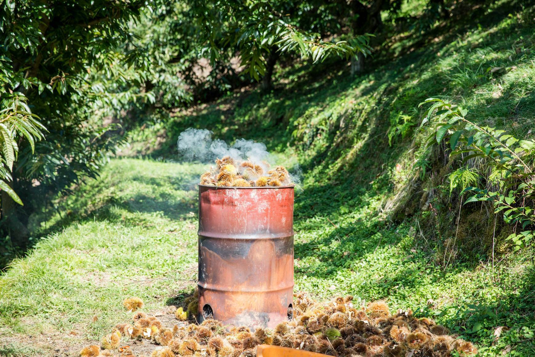 それと我が家のオリジナルとして、栗拾いと同時にイガも同時に拾います。拾ったイガは、園内に設置しているドラムカンに入れて焼きます。イガには害虫の蛹がついているものが多く、これを越冬させないように、来年の虫食い栗のリスクをなるべく避けるためにこの作業をしています。最盛期に栗・イガ両方拾うことは大変ですが、収穫直後の園内は裸足で歩いても大丈夫ぐらいきれいです。(笑)