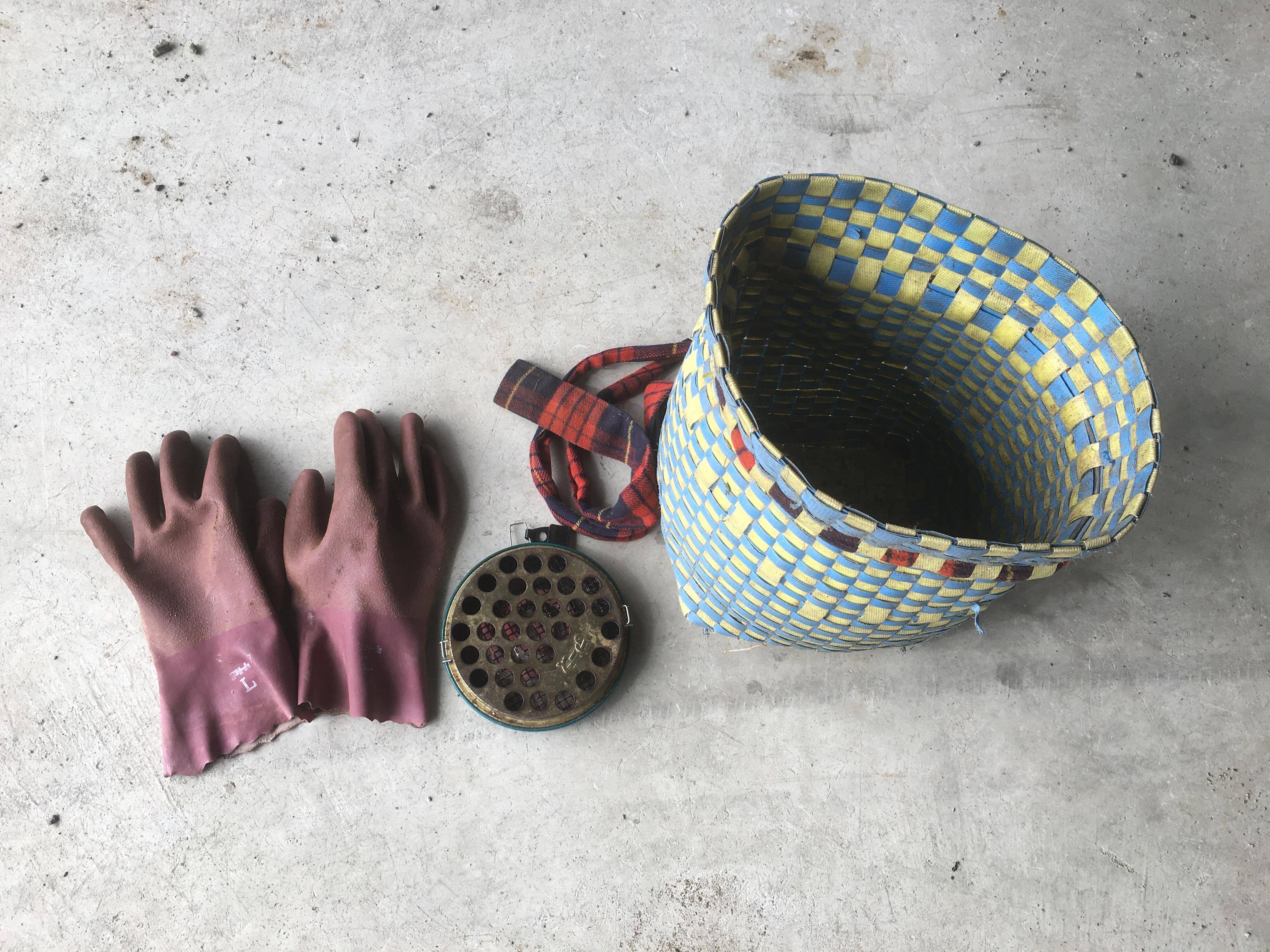足元は長靴か地下足袋。帽子に上着は長袖で、虫刺されを防止します。道具はタナカゴ(腰籠)、栗拾い専用のゴム手袋の2点。さらに蚊よけブヨ除けに森林香を腰から下げておくと安心です。