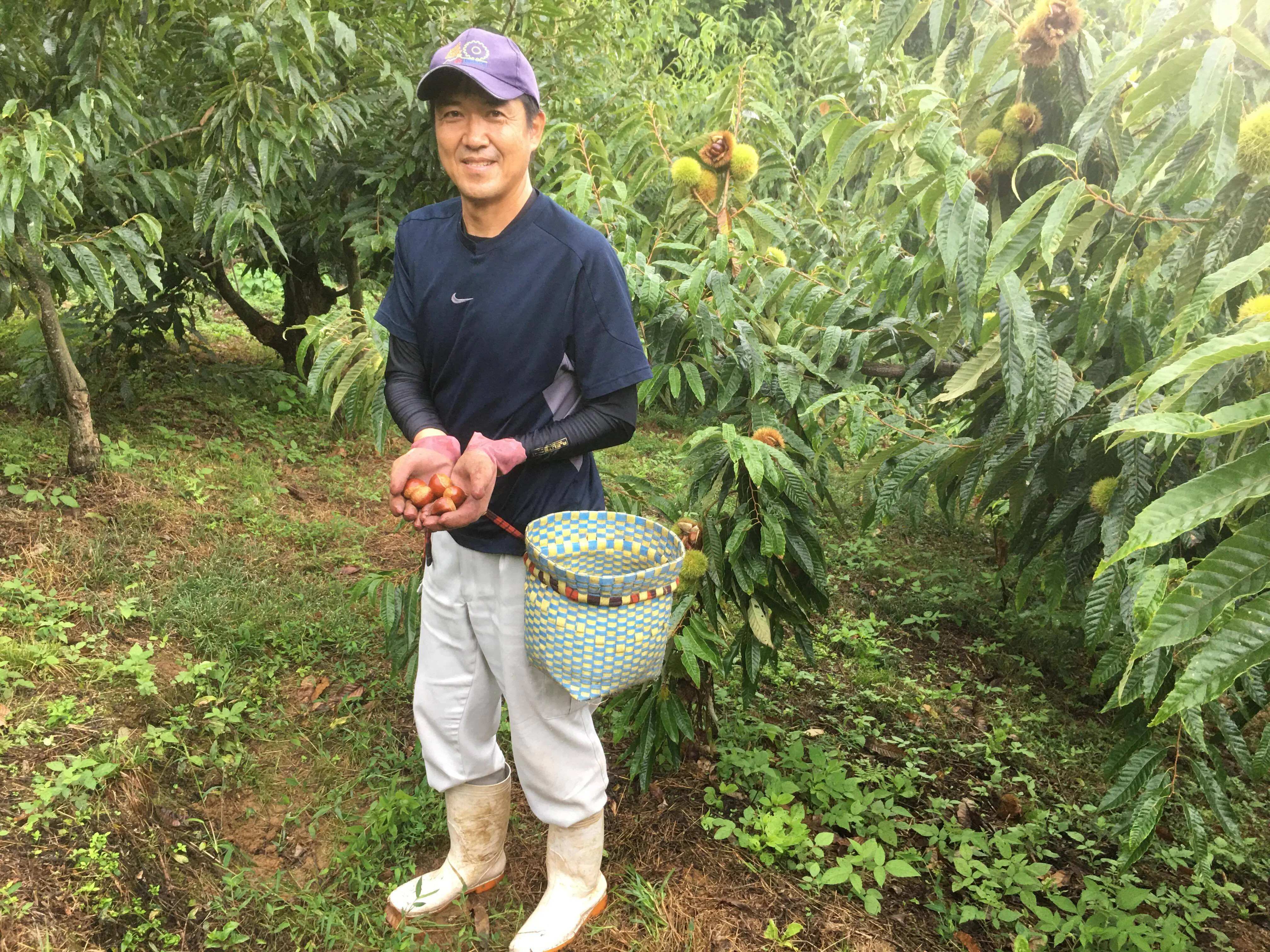 私の園地は急傾斜地なので、拾い方として下側から徐々に上に登っていきます。ただ拾うだけの作業ですがコツがあります。まっすぐ上がるのではなく、園地を下側から左右行き来しながら拾い残しの無いように園地を徐々に上がっていきます。初めての方は、目の前の栗に気を取られ、あっちに行ったり、こっちに行ったり、鶏が餌をついばむように歩きがちですが、そうすると拾い残しが出てきます。栗は鮮度が命ですから拾い残しは禁物なのです。