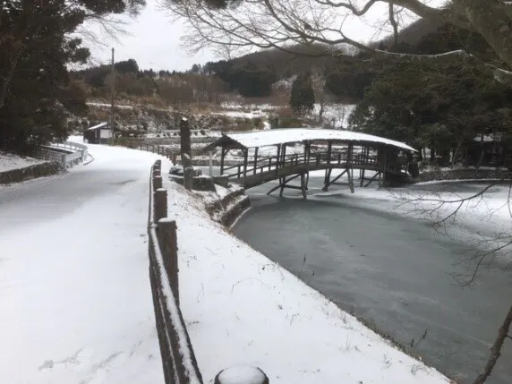 作業もできないということで、今朝、石畳の名勝「弓削の屋根付き橋」に行ってみました。池に氷がはり、その上に雪がうっすらと積もっていました。
