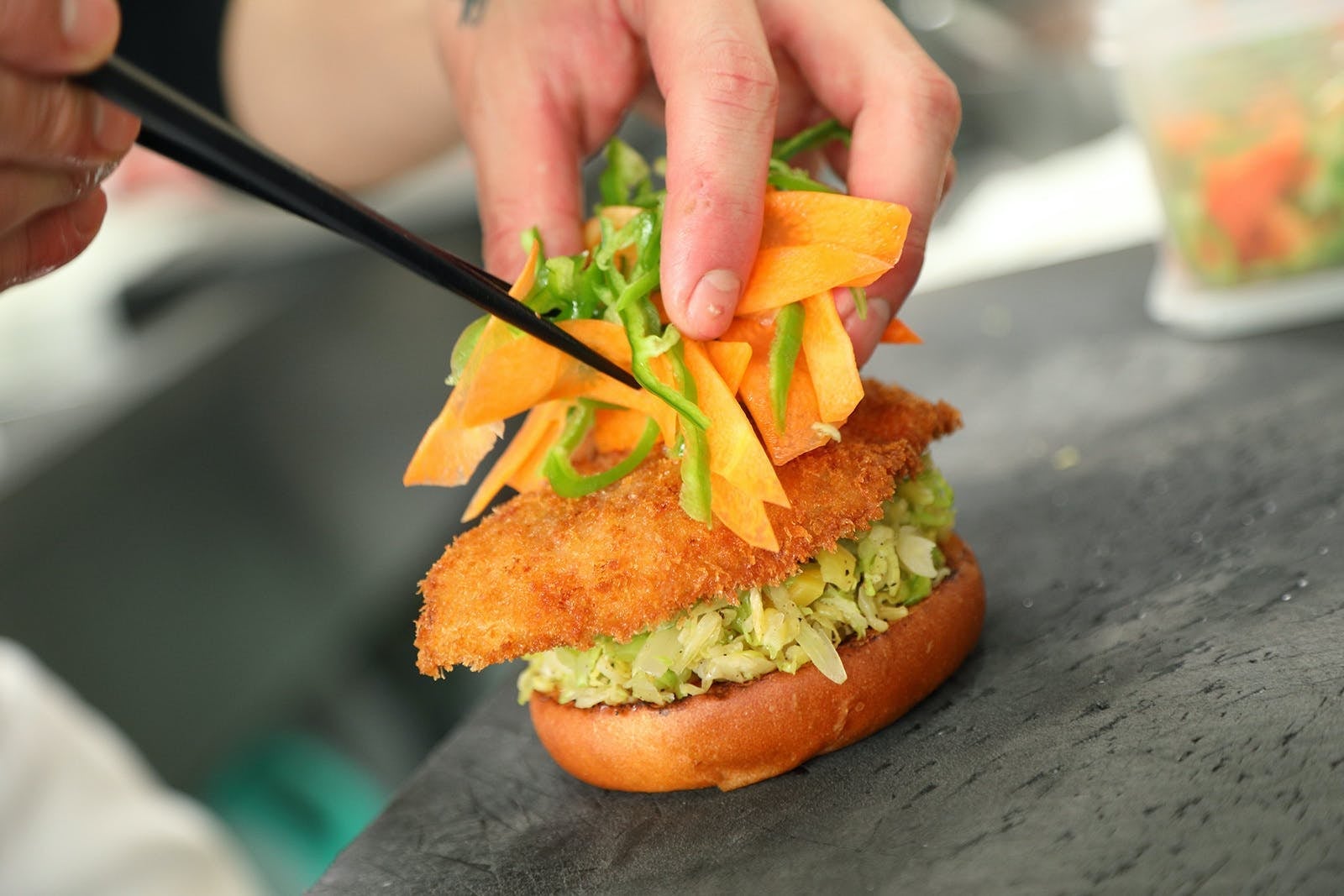 日本伝統の技法によるこだわりの和バーガー。「昆布〆フィッシュバーガー」、「漬けマグロチーズバーガー」、「西京焼きの最強バーガー」など、世界を探しても見つからないようなラインナップで展開しています!! また、9月よりラインナップをより充実させ通常ハンバーガーに使用している魚をこだわりの技で調理し新たな丼物や定食を始めていきます。 全ての料理において一切の作り置きはせず、オーダーを頂いてから調理するので、出来立てのお料理をお客様へ提供いたします。