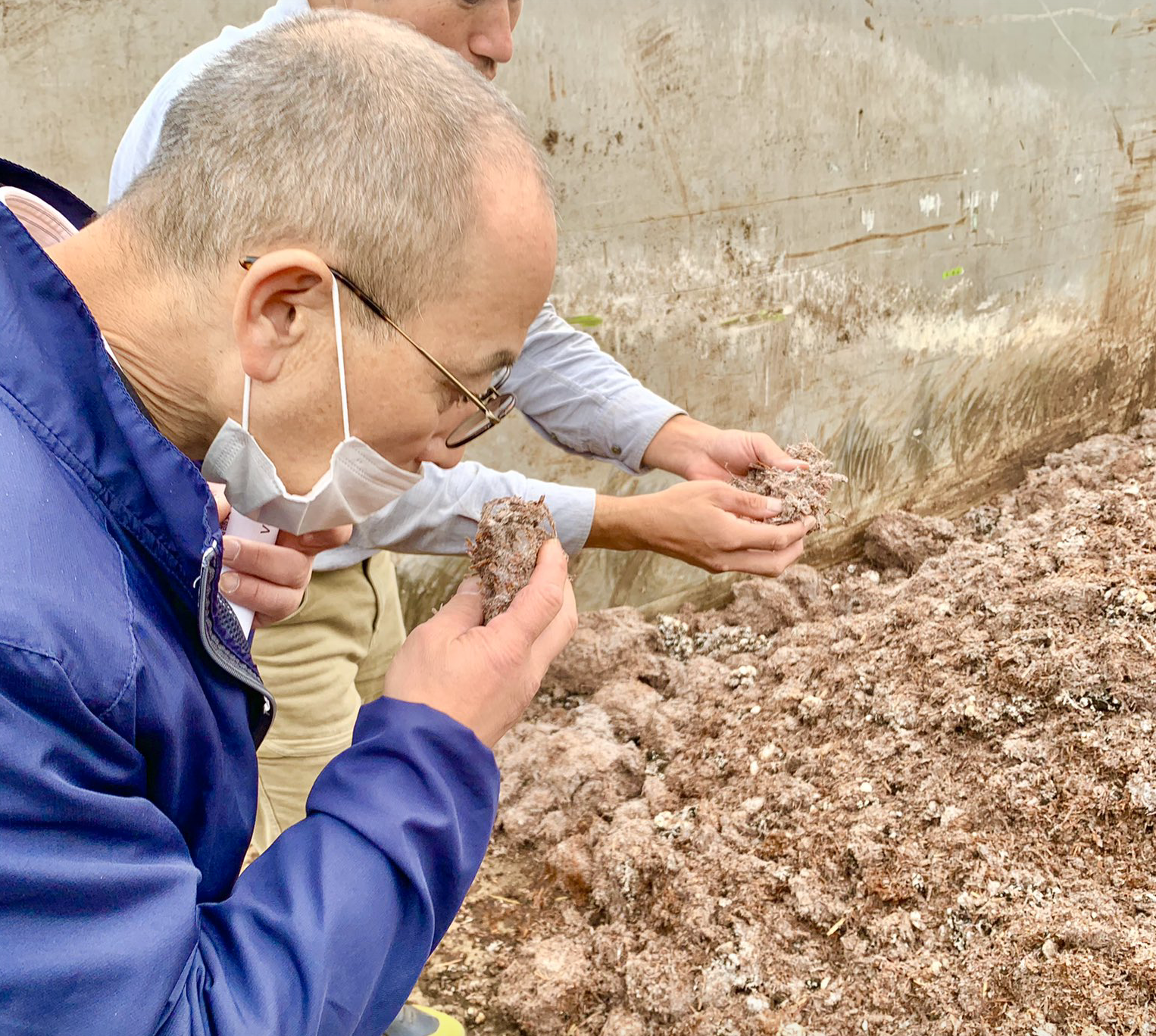 引退馬の馬糞堆肥の利活用を視察する角居師