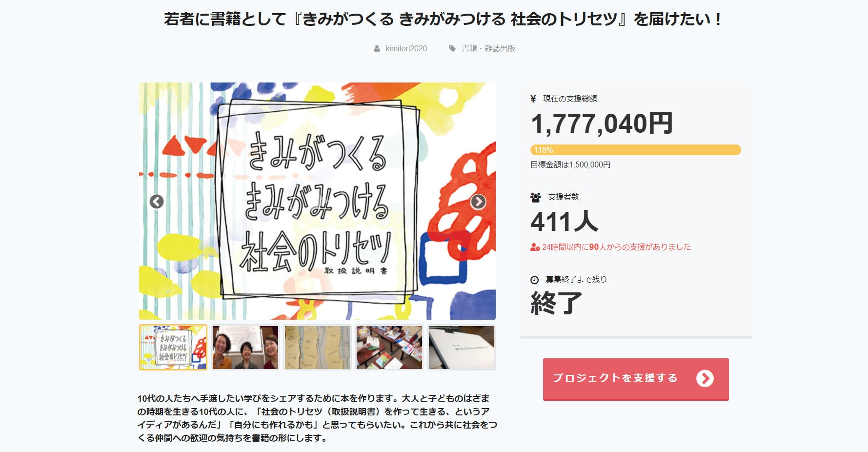 おはようございます。クラファン隊長の本橋です。昨晩(8月31日)の23時59分をもって、『きみがつくる きみがみつける 社会のトリセツ』出版企画、クラウドファンディングが終了しました。目標金額1,500,000円を目指して活動してきて、その金額を達成したことは、昨日ご報告した通りですが、最終的に、支援総額 1,777,040円達成率 118%支援者数 411人という結果で終えることができました。たくさんのご支援、本当に、本当に、ありがとうございました。ありがとうございました、しか言えない自分がもどかしいですが、ありがとうございます。本当に。最後数日間の追い上げが、すごかったです。支援してくださった方々のさらなる支援、皆さんの呼びかけによる広がりを、しっかりと感じました。燃え尽きた執筆メンバーからは後ほど、またあらためてご挨拶することになるかと思います(笑)。『きみトリ』プロジェクトはまだまだ続きますが、まずはクラウドファンディングにつきまして、結果のご報告とお礼を申し上げます。本当に、皆さん、ありがとうございました!!!追記昨日の夜と今朝と、サイトの文言が変わっていたので、こちらもスクリーンショットを記念に。(文責:本橋祈)