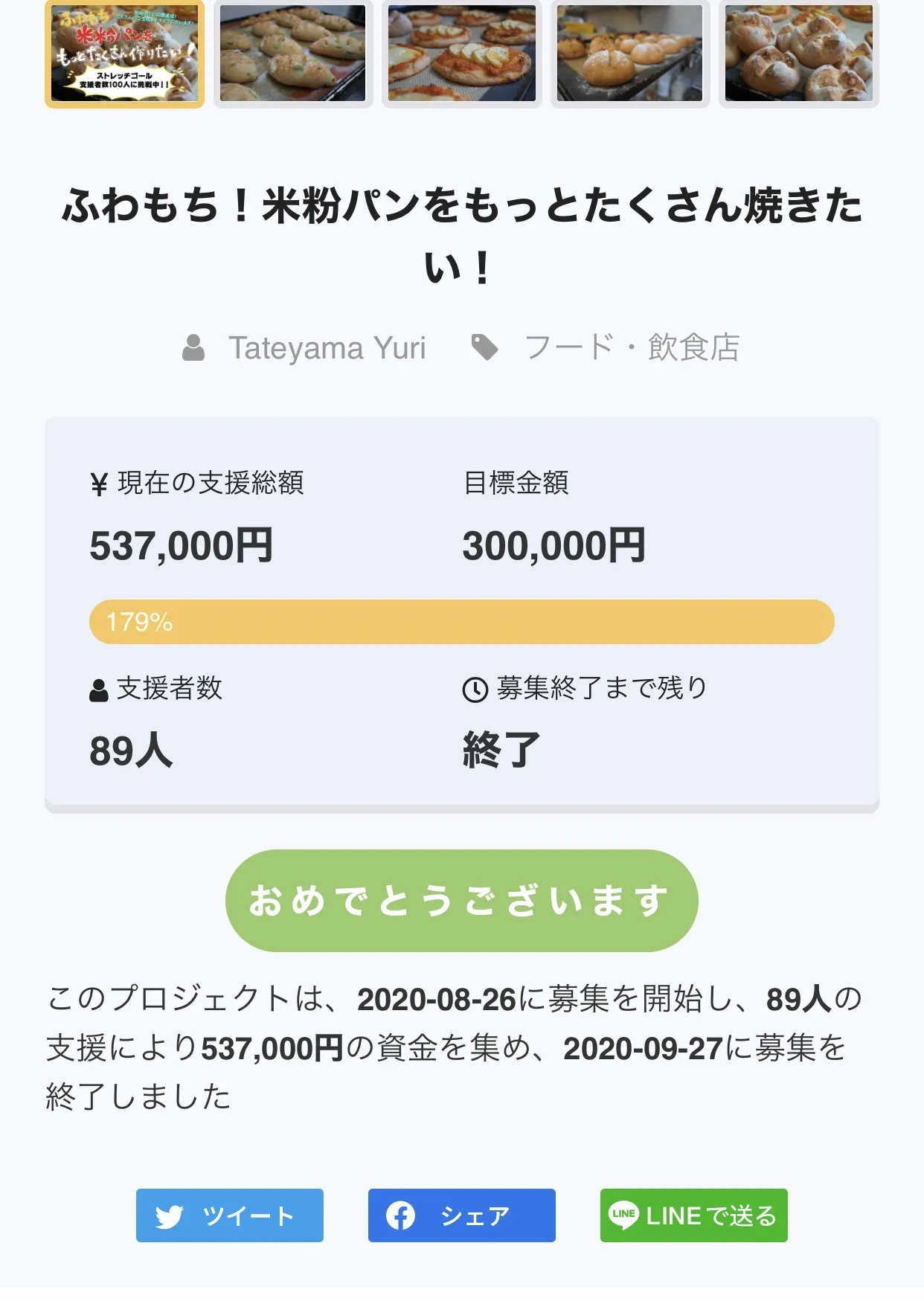 2020/09/27 09:47いよいよプロジェクトが終了します!!まだまだ日数があると思っていたのにあっという間に残り数時間となりました。目標達成後も支援してくださる方が増えて、嬉しくも身の引き締まる思いでいっぱいです。新しく導入できたニーダーと発酵器で2回の工房販売をいたしました。回を重ねるごとに慣れてきて、レシピにより磨きがかかったように思います!より美味しいものが支援者の皆様へお届けできるよう頑張ります^^残り数時間ですが、最後までお付き合いください。どうぞよろしくお願いいたします!写真は今日の我が家の朝ご飯に食べた米粉パン。ハムコーンパンとつぶあんパン、ミニ食パンです。ふわもち、温め直しで復活です!どんな種類のパンをリターンでお届けしようかな。楽しみにしていてくださいね♬ もっと見る