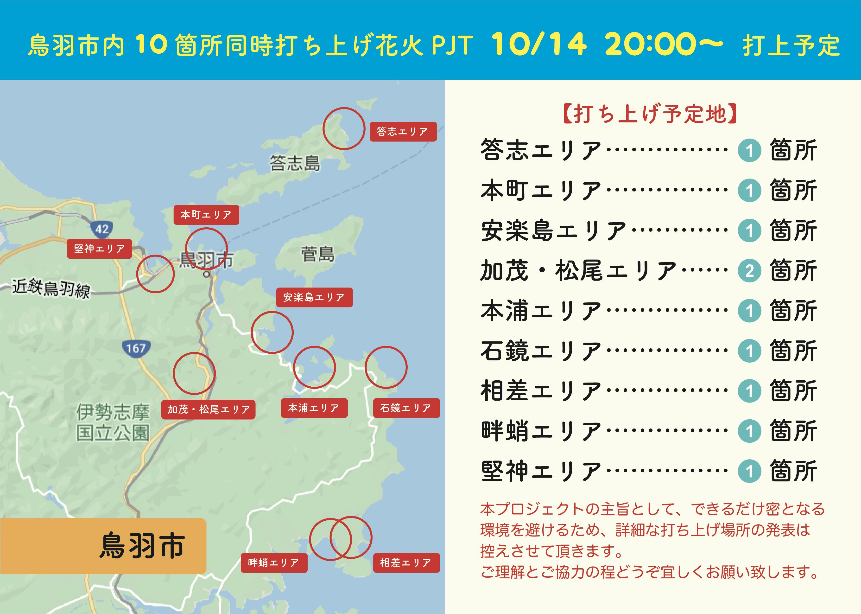 本日堅神エリアの使用許可も頂くことができ、本来の目的通り鳥羽市内10箇所同時での花火打ち上げが行える運びとなりました!!