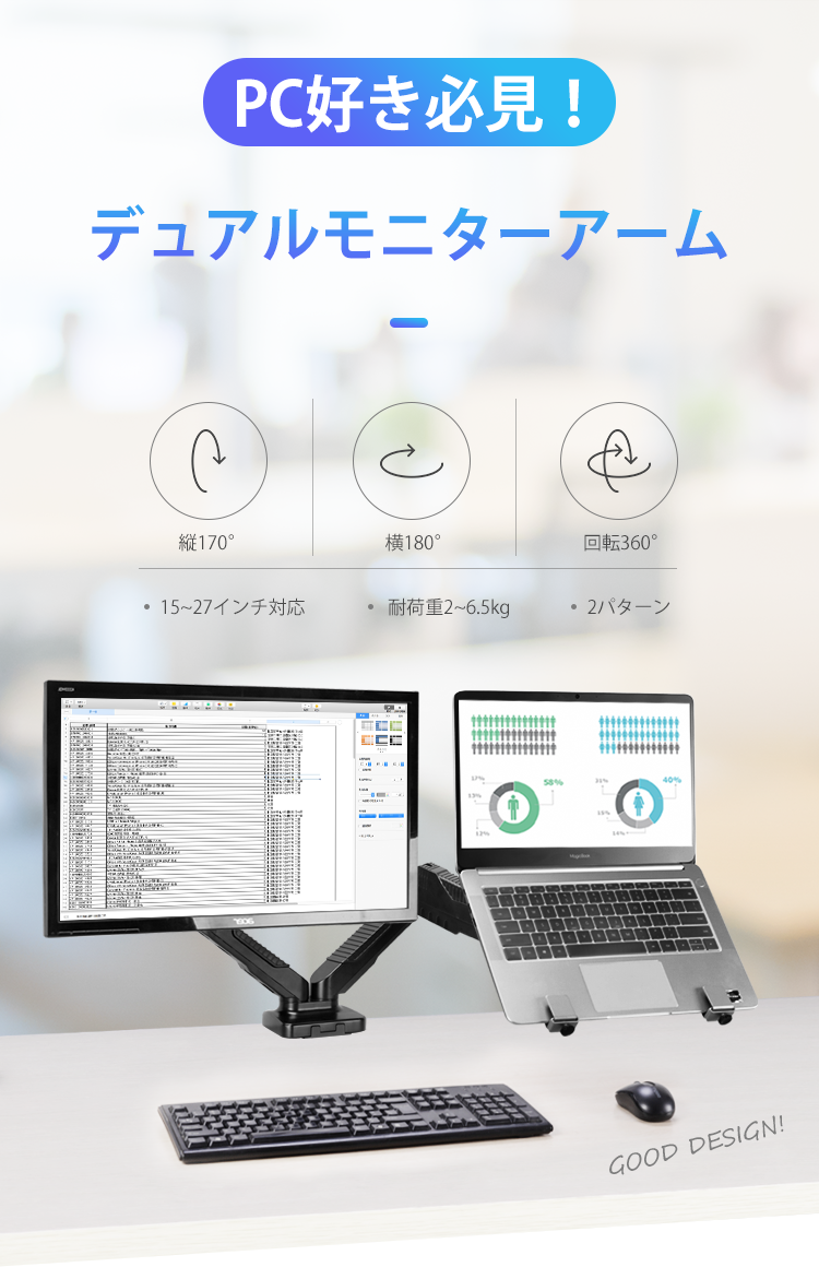 「困った・・・」という時にオススメなのが、この「デュアルモニターアーム」!