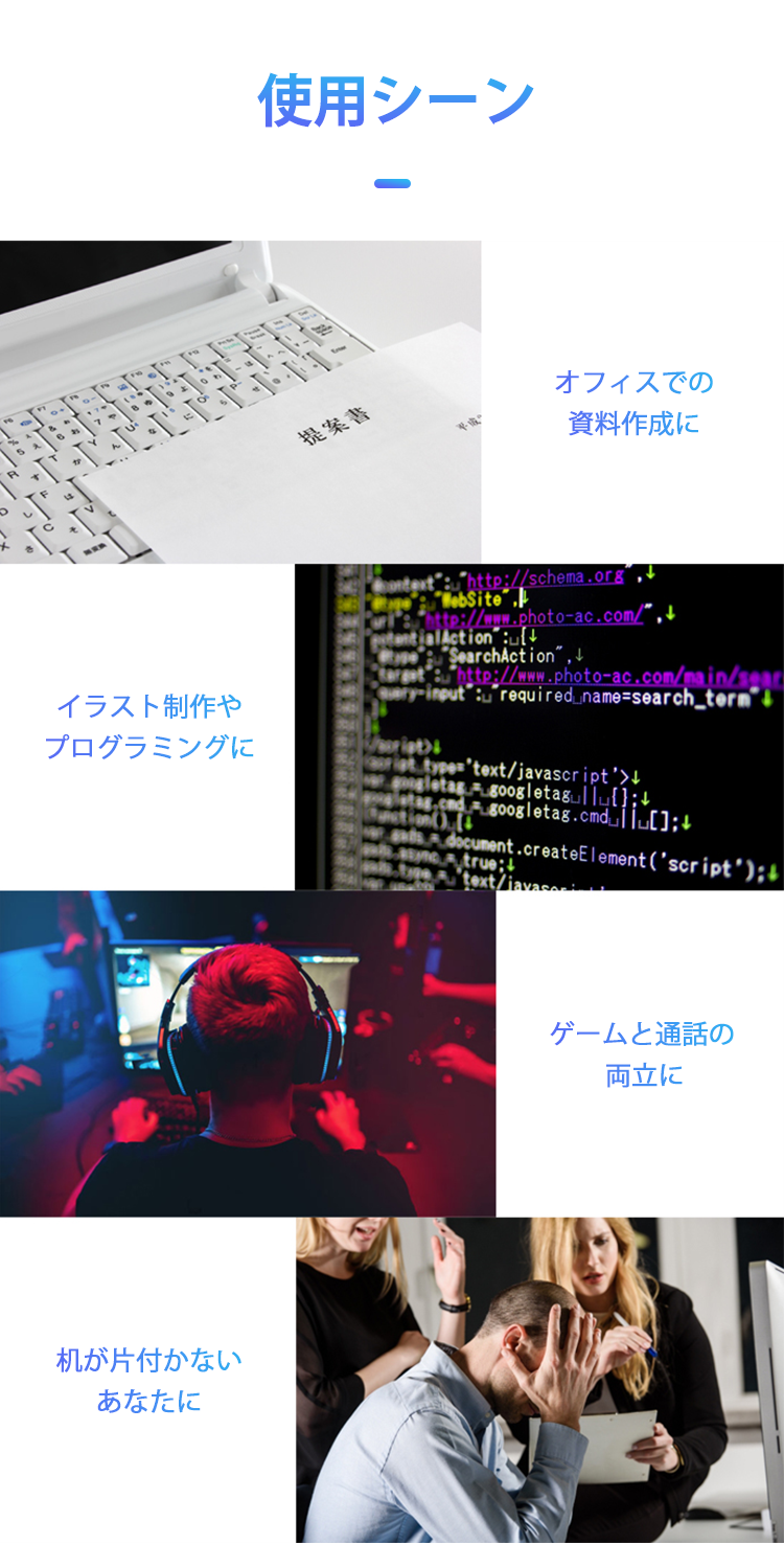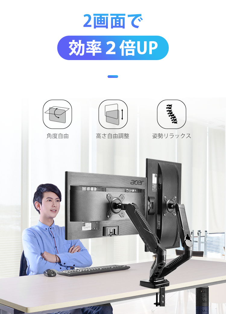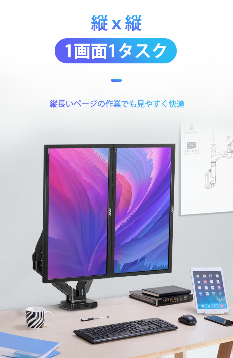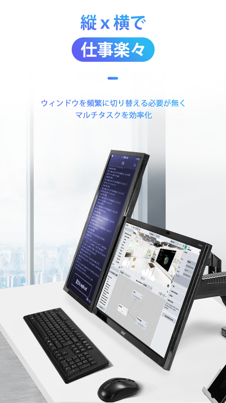 一般的なデュアルモニターは横向きに2つ並べて使用することが多いですが、この商品は様々なシーンで活躍。