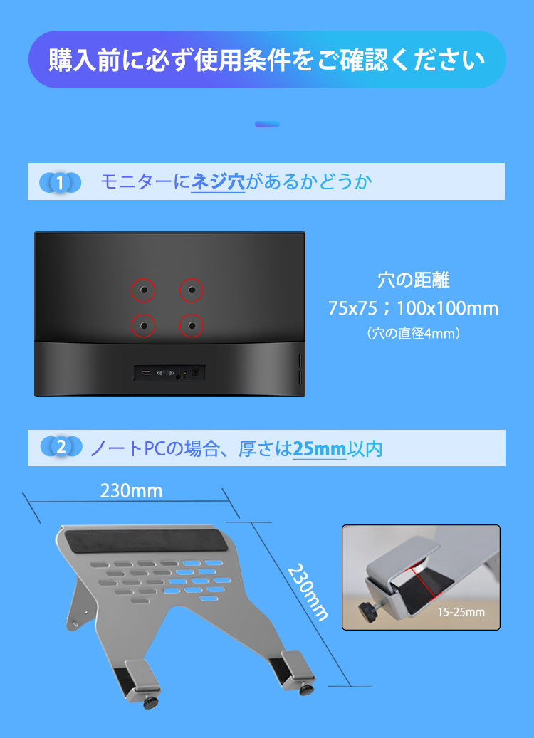 モニターの取扱説明書やメーカーのWEBサイトなどでVESA規格に対応しているかどうか確認して下さい。