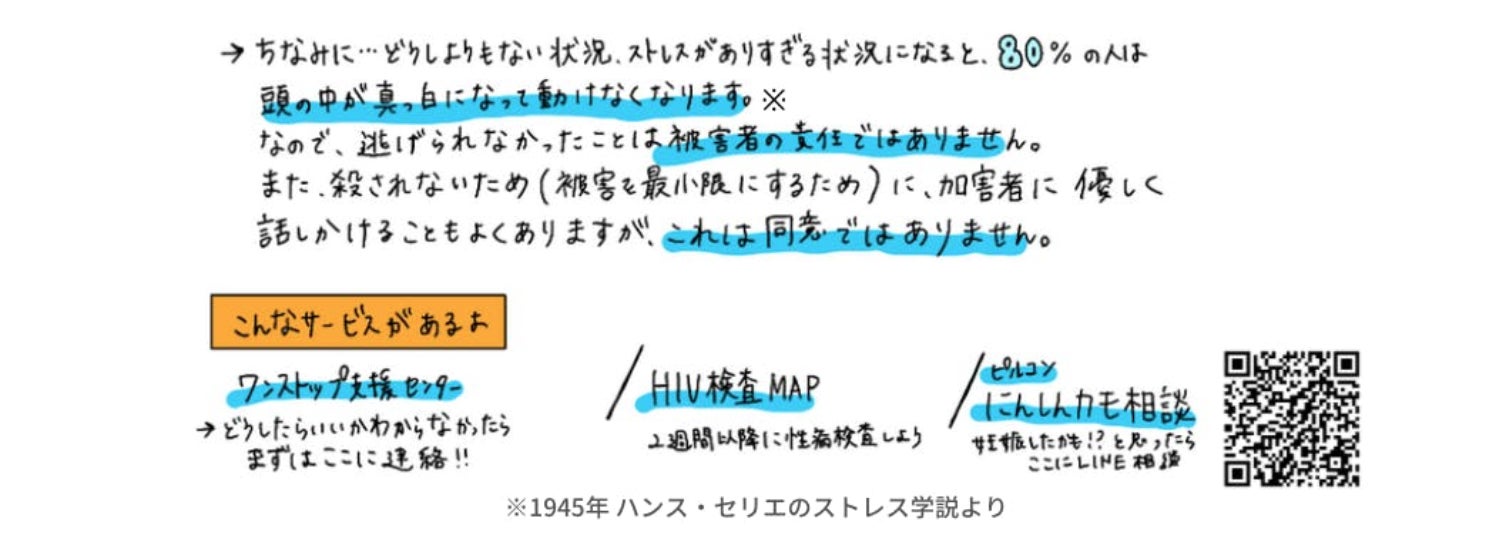 「お前に隙があったんじゃないか」「なんでそんな思わせぶりなことしたの。」被害にあってすぐに、そんなことを言われ 傷ついた人たち、「自分に責任があった」と誰にも言えずに抱え込んでしまっていた人たち、誤ってそのような被害者をさらに傷つける言葉を言ってしまって後悔している人たち、そんな「性知識を得る場がなかった・頼った先の人の知識がないために傷ついた人たち」を沢山みてきました。