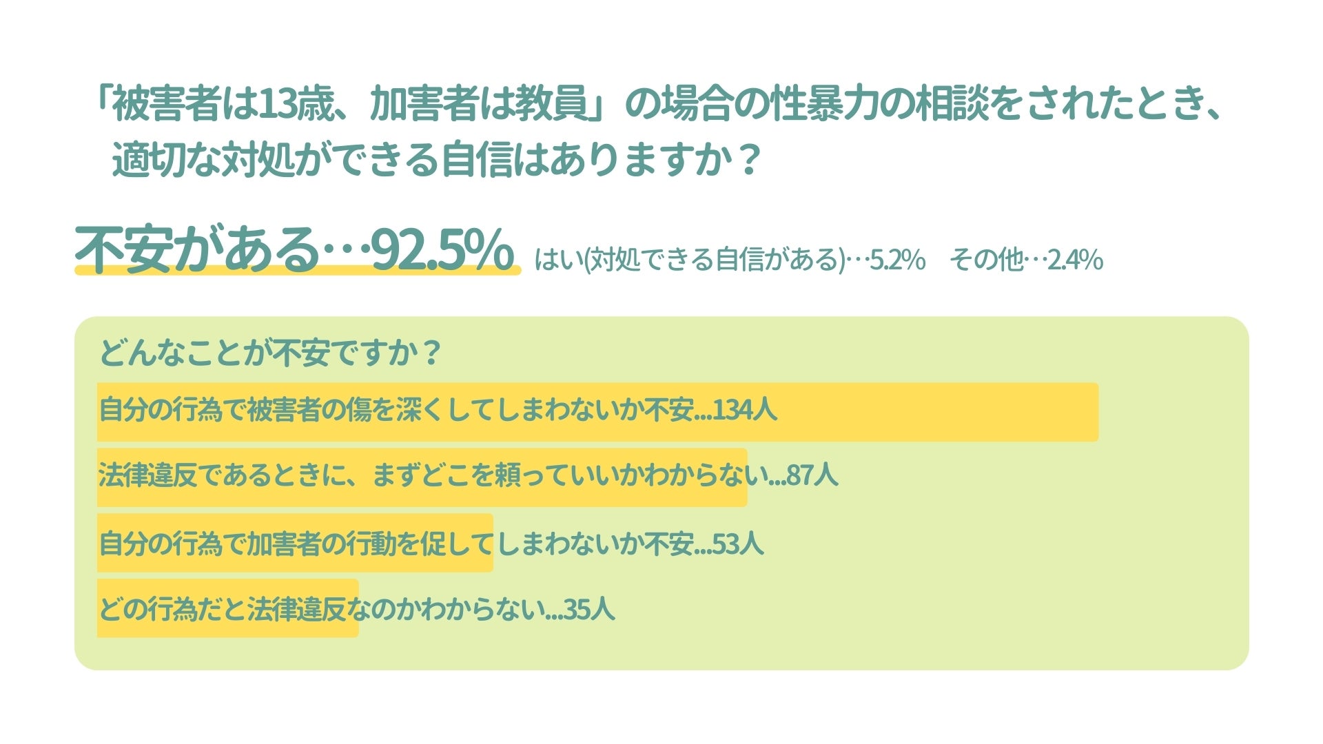 先日ソウレッジが行ったアンケートにおいても、「被害者は13歳、加害者は教員」の場合の性暴力の相談をされたとき、対処ができる自信はありますか?という質問に対して、92.5%の方が「不安がある」と回答しました。
