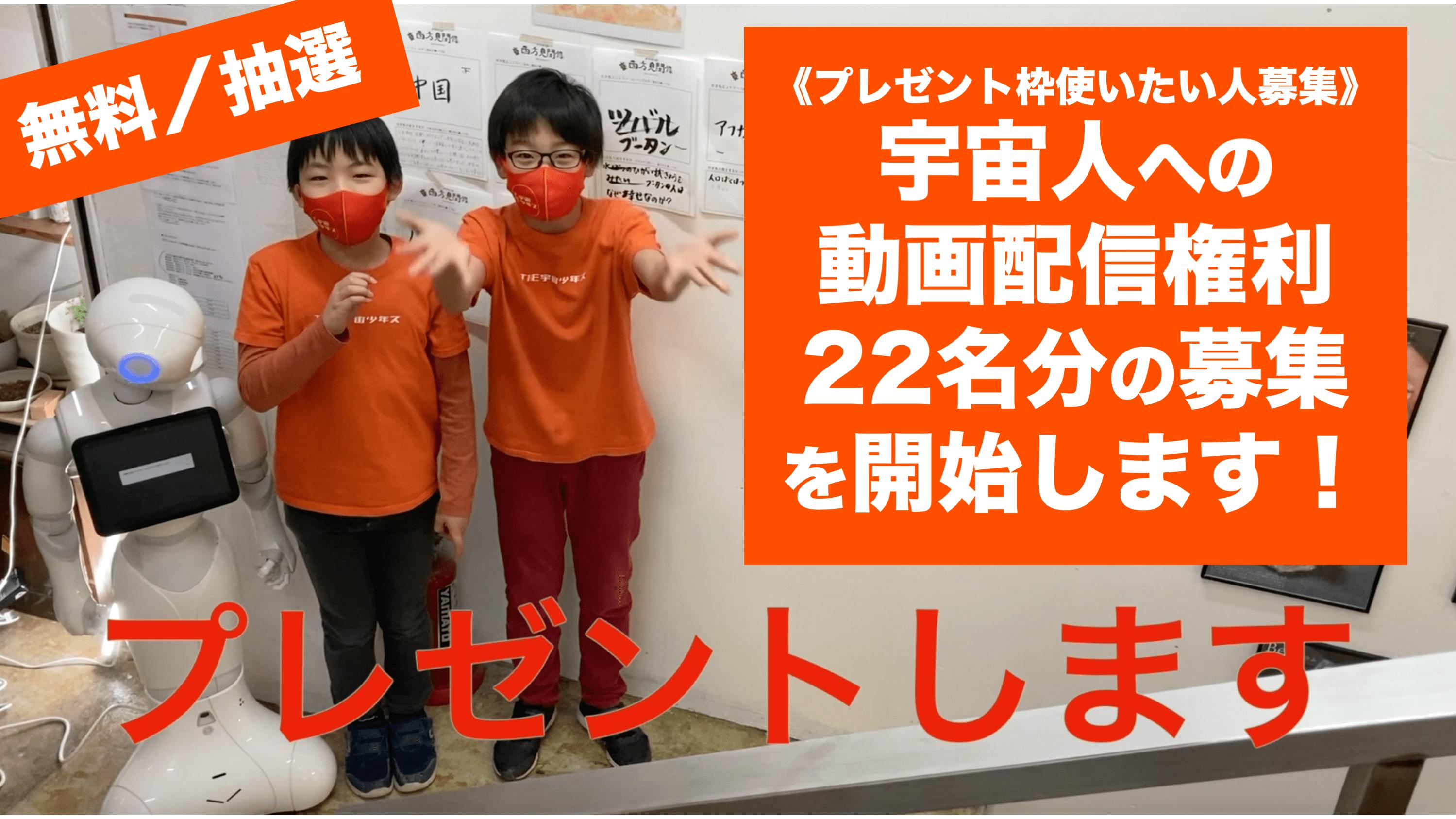 ということで、22人の宇宙少年たちに「宇宙人への動画配信」をお通して、宇宙に手が届きそうな体験を無料で提供します。「参加してみたい!」と思った方は下の文を読んで是非参加してみて下さい。