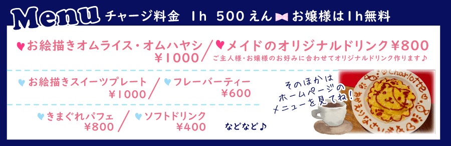 ご主人様・お嬢様にお気軽にご帰宅いただけるように、なるべくリーズナブルな価格でお食事やドリンクもご提供させていただいております。