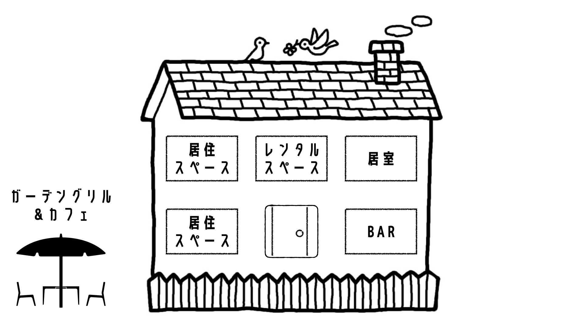 庭を地域に解放したガーデングリルレストランカフェに、空き部屋を活用してプリザーブドフラワーリース手作り教室や地域での企業を目指す方向けのローカルビジネススクールといった、レッスンに使用出来るレンタルスペースなど、複合的なコンテンツを整備し、ただ住むだけじゃなく、日々の暮らしを楽しむ様々な場所として整備します。
