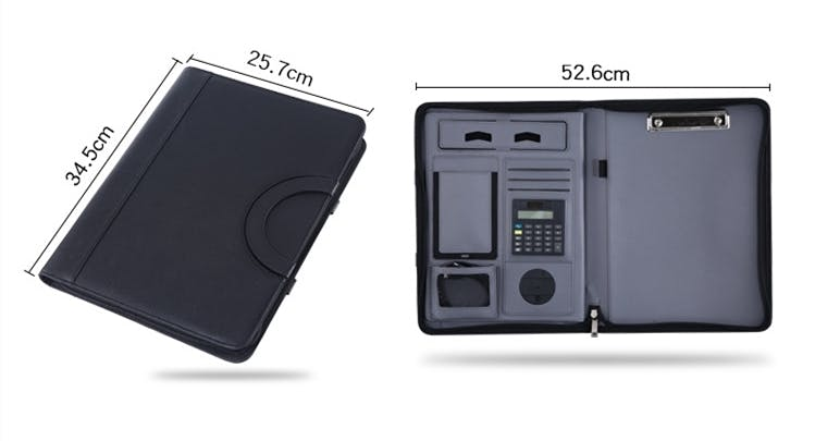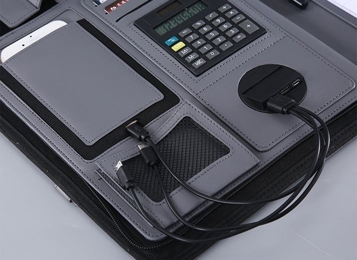 こちらの多機能フォルダー「EGO」は、中身をすっきりと仕分けて、さらにビジネスツールであることを最優先に考え、ワイヤレス充電ケーブル充電スタンドカルキュレーターなどの機能を充分に備えていて、PU材質のスタイリッシュなデザインでビジネス用に重宝します。