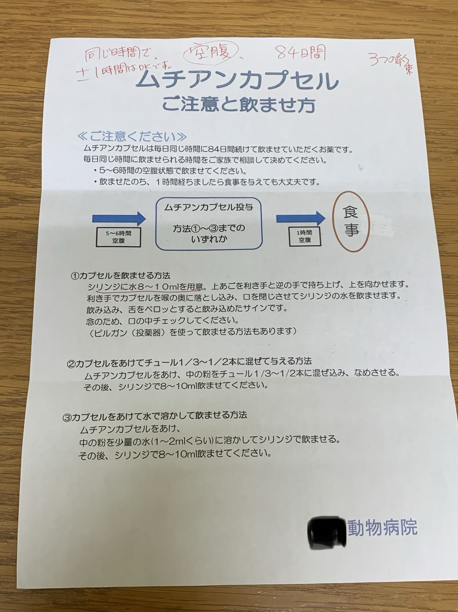 カプセルのお薬で、体重1kgあたり100mg(税別3,000円)の服用が目安です。