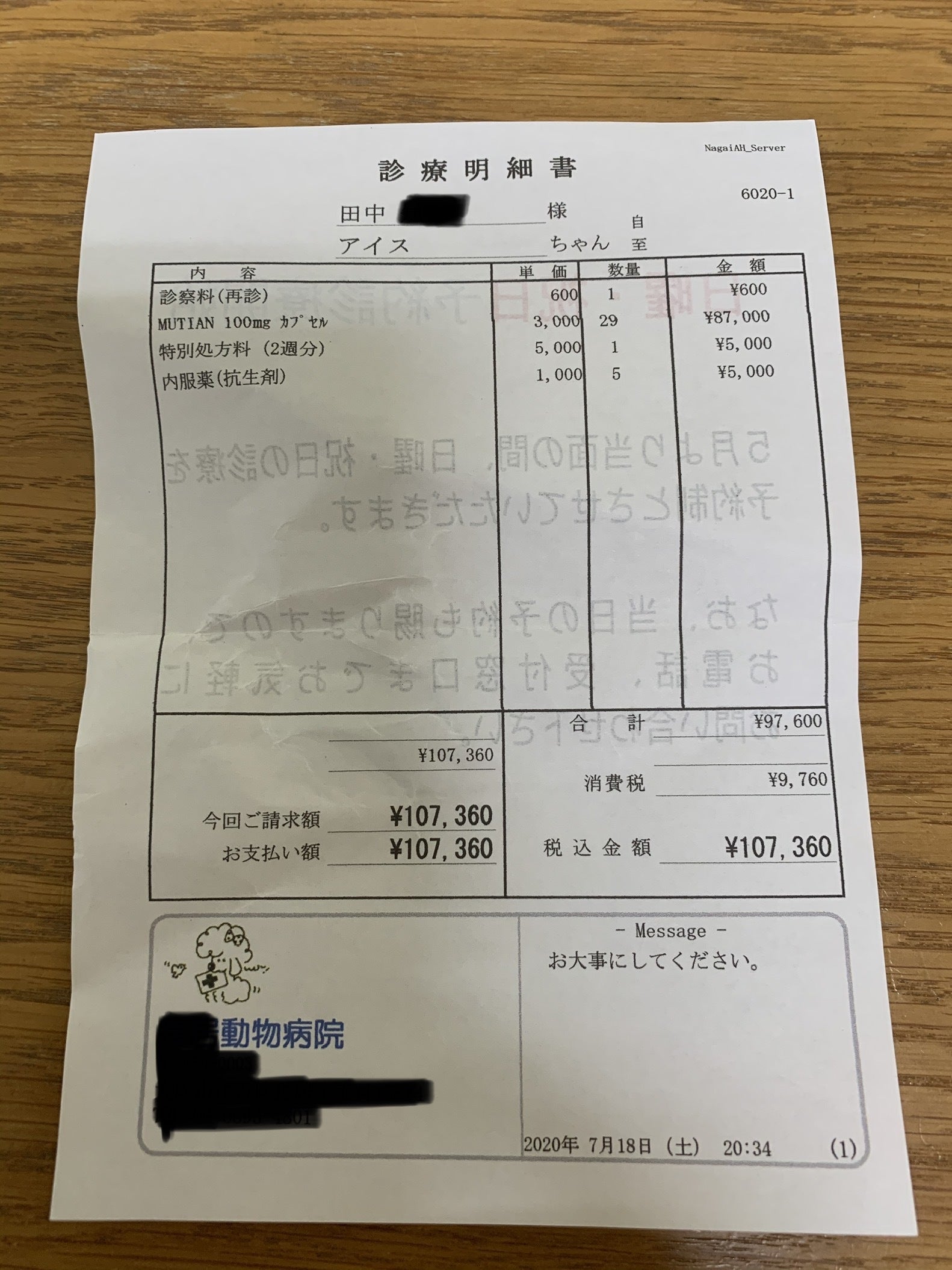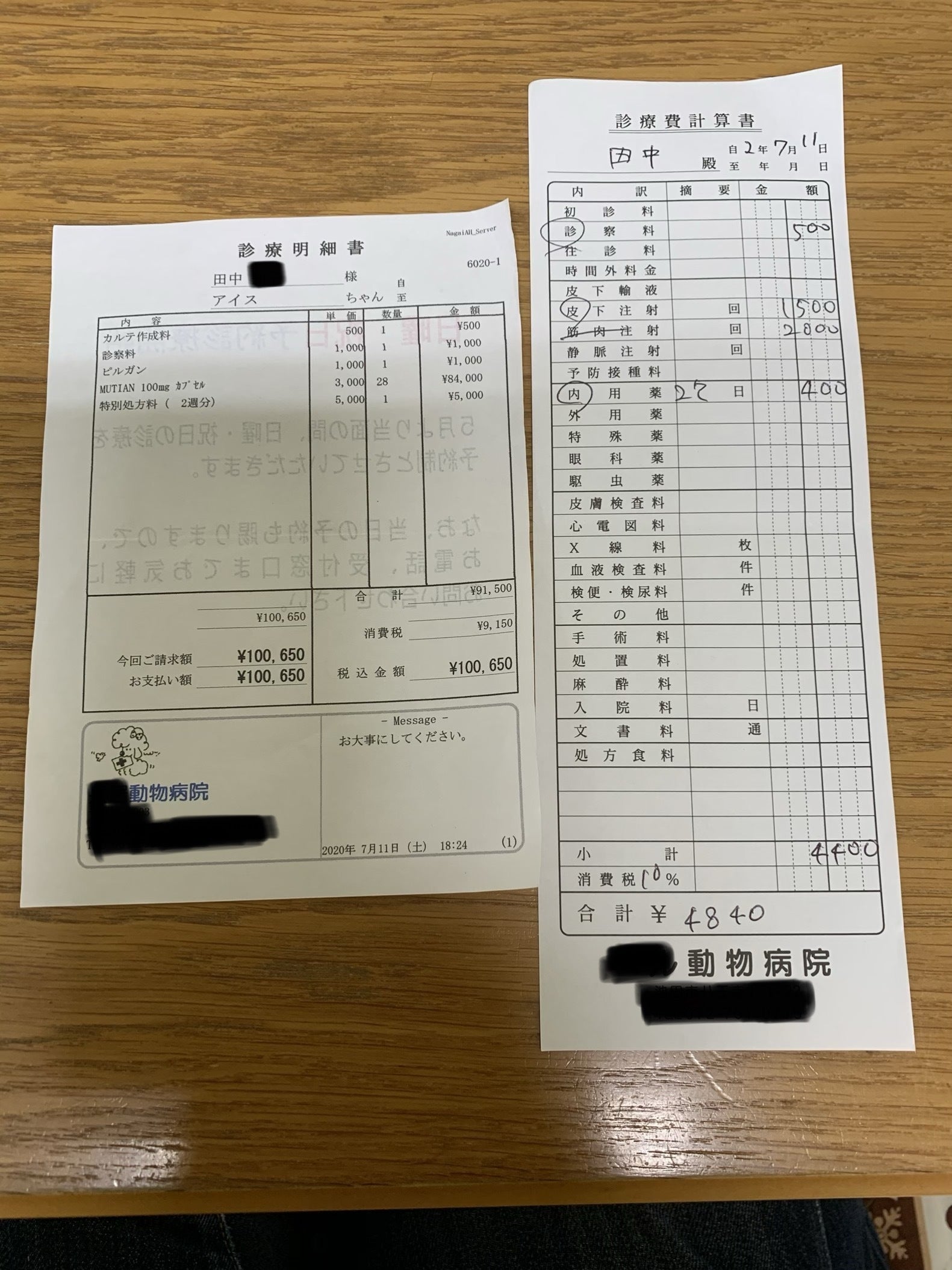 ご飯を食べなくなった日、かかりつけ医と協力病院での領収書