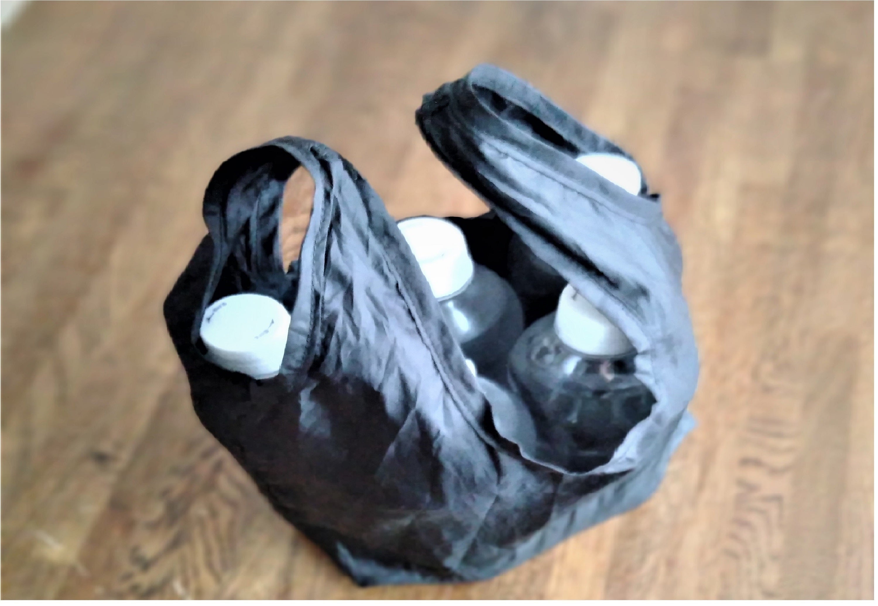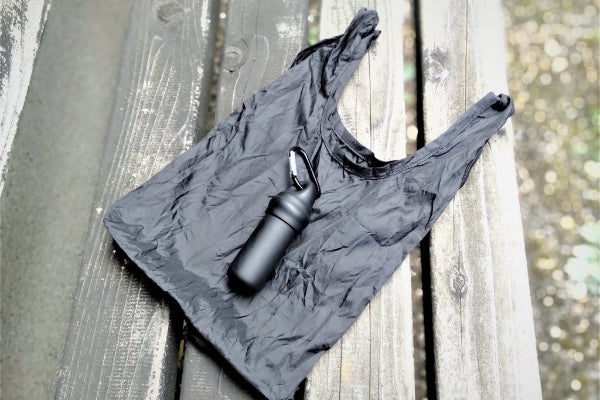 スティックバッグはコンパクトに収納出来るバッグです。手に収まるサイズなのでスマートに持ち運び出来ます。買い物袋は小さめに設計されているのでコンビニなどちょっとした買い物に活躍します。(500mlペットボトル5本入ります。)