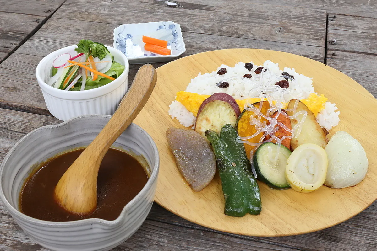 温井ダムカレーです。野菜が周りの山々。卵が堰堤、ご飯をダム湖に見立てカレーをかけてお召し上がりいただきます。野菜は時期により変わります。テイクアウトも可能です。