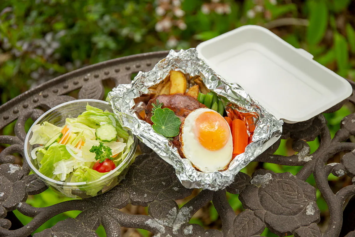 ハンバーグセットのテイクアウトです。この他に豚カツセットなどもございます。