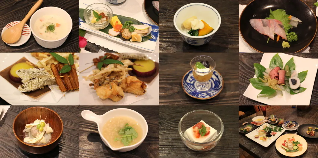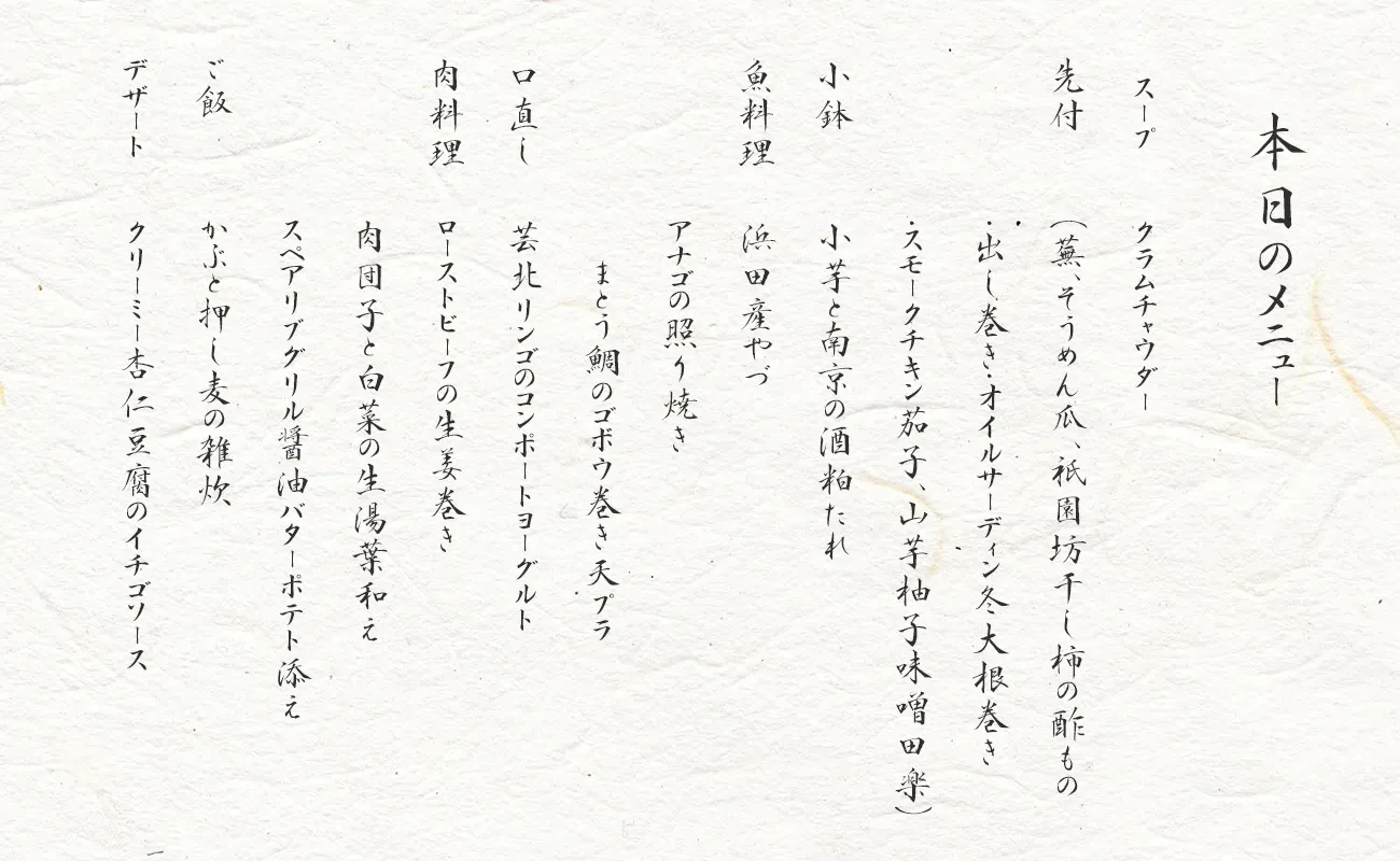ある日のコース料理のメニューです。安芸太田町の豊富な野菜を色とりどりに工夫を凝らしたオリジナル料理でお客様に喜んでいただけるメニュー作りを心がけています。