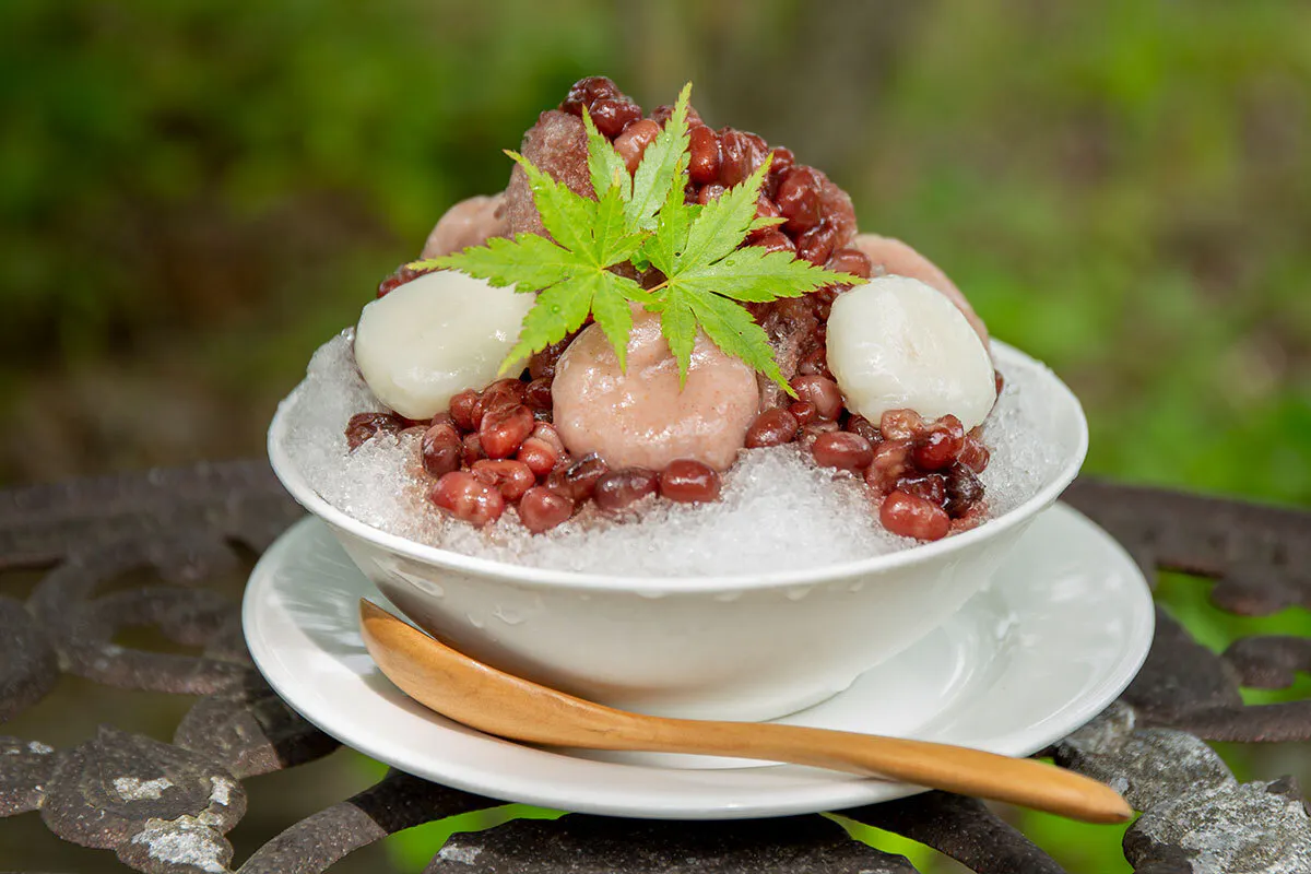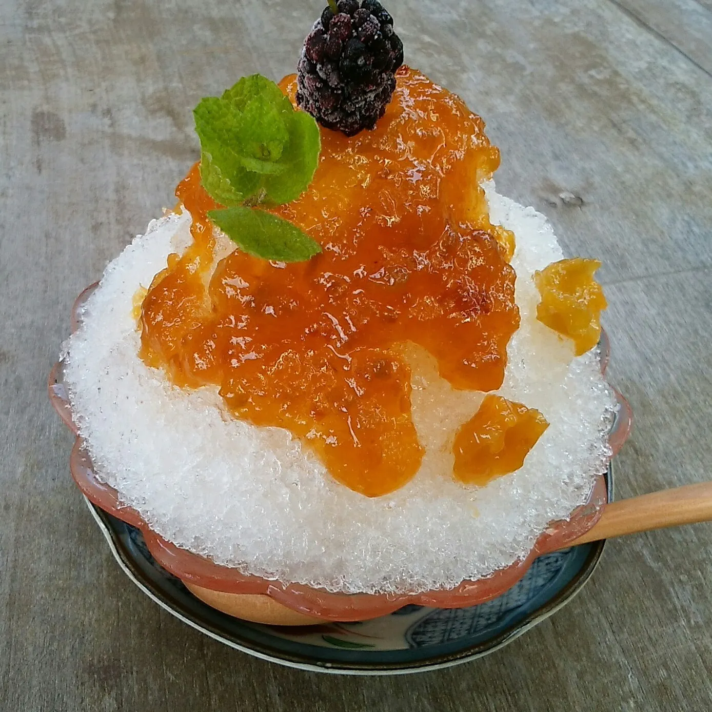 ここ温井で採れた梅から作ったジャムシロップを沢山使用したかき氷です。梅は完熟で、甘酸っぱいパワーみなぎる美味しさです。