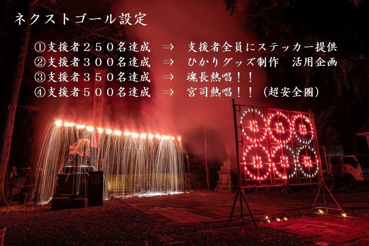 2022/09/29 11:09こんなにも…多くの方のご支援をいただきありがとうございます!!こんなにも…報告が遅くなってしまい申し訳ございません!!あんなにも…毎夜集りがあってキツイ~と思っていたのに、終わってみると喪失感が大きく、いまだに本調子に戻っていない気がします。なななんと、ALL真田魂でもまだ反省会が行われていません。らららんど、一説には当日反省しすぎた感も否めませんが…。今回のプロジェクト『真田の仕掛け』『御柱祭』ご覧いただいた方、ご参加いただいた方はいかがだったでしょうか?花火で今年進化(と呼べるのか~)した事は、なんといってもアイドル風ユニットの結成!!平均年齢は…えっうそ、25歳!?計算間違えているかな…(想像しているより若かったとか言ったら怒られるか)。依頼するも断られ(※普通の反応です/もれなく宮司の品性が疑われ)ねばりにねばり断られ(※ごく普通の反応です/急上昇で品性が疑われ)最終兵器 手作り工房『結』店主にもちかけると「えっ!?…やるか!!」(品性を疑った)≪祝 SND6結成≫何かをはじめる時は、どう転ぶかわからないのは確かだと思います。私なんかは慣れているので、すべろうが失笑されようが呆れられようが、その先に誰かつづいてくれることや、宮司でああなら色々やってみようと思ってもらえるような世界を見ているのでよいのですが…大きな負担をかけてしまった事と思います。…がなんだかとても盛り上がっていましたね(笑)才能あってうらやましいなぁ~。見ている人も一緒になっている空間、ステキでした。形は違えど和楽の本質に近く笑顔あふれてました。新しい事をはじめられたことは将来的に広がっていく可能性が拡がりますが、なにもやらなかったらなにもおこらなかったので本当にありがたいです。プロジェクト本文に書いた事に似てますね。最初に走り出す人は周りから色々言われるし大変だと思いますが、楽しめるようにサポートしますし、なによりこちらも楽しみますので、えぇ~と、メンバー募集中です!!仕掛け花火については、ALL真田魂は不器用な人たちなので、音楽にのせて気持ち込めて自分たちのメッセージを発信する形とさせていただきました。(マイクの性能なのか使い方の問題なのか、よく聞き取れなかった部分もあったようですが…次回対策練っていきます)いや、おっしゃる通りです!!のどから出かかっている言葉は重々承知しています。これに関しては、申し開きができません。ごめんなさい自分たちが楽しませてもらっています。支援者300名達成企画の指輪ライトに合わせたスリーセブンコール、こちらから見ると仕掛け花火に負けないくらいのインパクトありました!!来年はみんなでライトで波をつくったり何か表現できたら面白いなぁと考えているので、次回もよろしくお願いします。宮司は直前に練習しすぎて、指先水膨れになってました。きっと時同じくはじめたドラム初心者のおかめさんも手がマメだらけで痛かったんだろうなぁ~。今度おかめさんのドラムスティックビフォーアフターのお知らせしたいです!!きれいめな状態です(笑)仕掛け花火『カンガワ』Amazonで10000円!!4線増やした~。真田魂の法被着ている人に火付け方(言い方~)をお願いしました。実はこの花火のアイデアをいただいたのは、初回撮影リターンを申し込んでくれた方なんです。着火する人も楽しそうで、また意外にも(おい!!)花火も良い感じ。みんなで楽しめるような企画となり感謝しています。ほかに何かできるかな?と楽しみです。自分たちで作り上げ、感謝と感謝でつながっていく空間を『真田の仕掛け』は目指しています。次回は何ができるか、反省を活かしてどう対応していくか、の繰り返しとなっていく事と思いますが、毎年の楽しみにしていただけたら幸いです。また私の代になってから過去一番、飲食の出店が多い日となりました!!お祭の縁日っぽく多くの方に楽しんでいただけたようで嬉しく思います。こうしたご縁のひろがりも、関わってくれるみなさまのお蔭です。ありがとうございます!!引き続き、花火と御柱についても報告していきたいです!! もっと見る