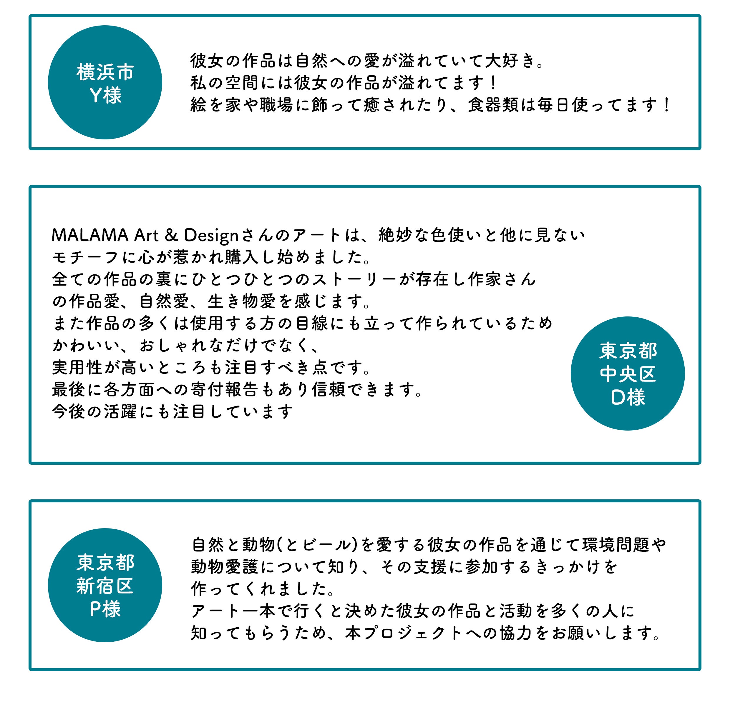 ハワイや日本の自然、動物などを題材・モチーフに制作活動をしていて、作品売上収益の一部を動物愛護活動や自然保護活動をしている方々へ寄付しております。
