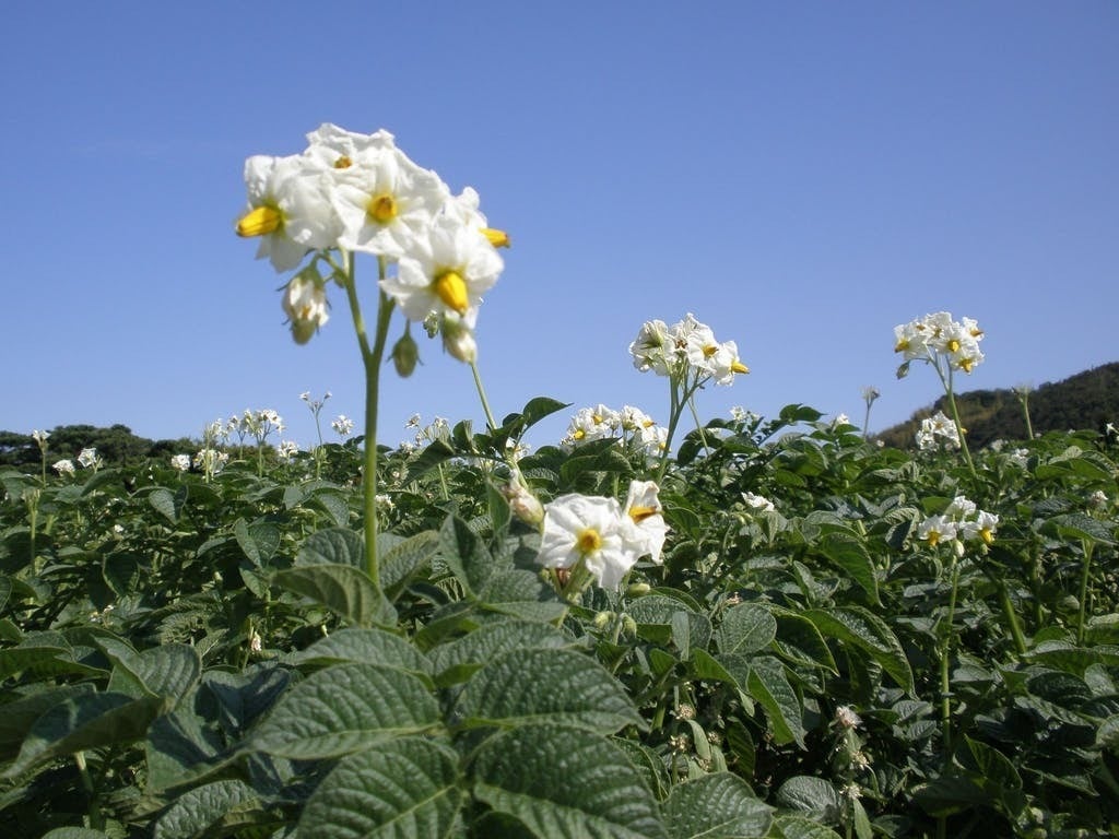 広島県竹原市吉名町は、ジャガイモが特産品です。これは、ジャガイモの「出島」の花です。白くて可憐な花です。