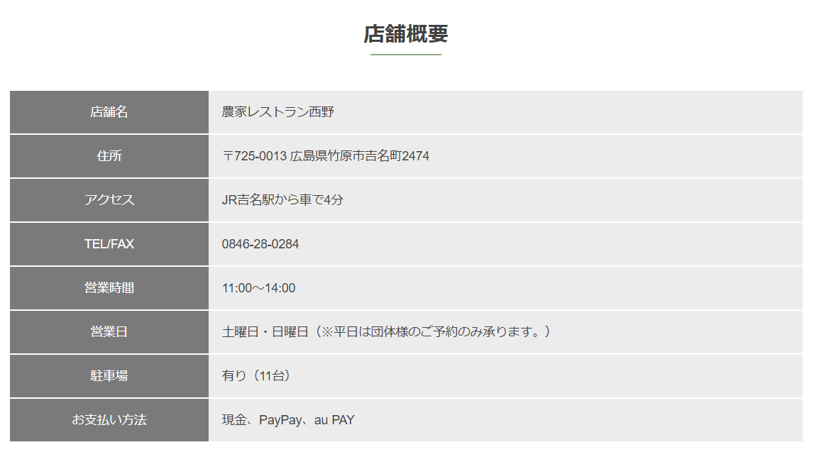 平成19年(2007年)9月に広島県竹原市吉名町にオープンしました、”旬の野菜と特産ジャガイモ おばぁちゃんの田舎料理”を提供している農家レストラン西野です。