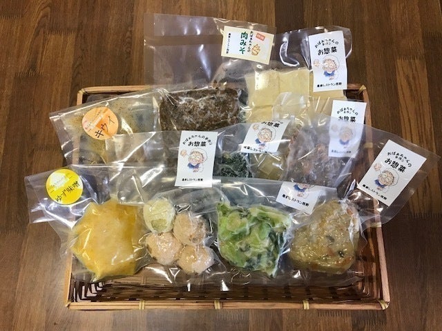 肉みそ(峠下牛・たけのこ入り)、高野豆腐、おから煮、煮豆、じゃがおはぎ、ほうれん草のおひたし、切干大根煮、南蛮漬け、ひじき煮、ゆず味噌ソースなど、約10種類のお惣菜をセットにしました。