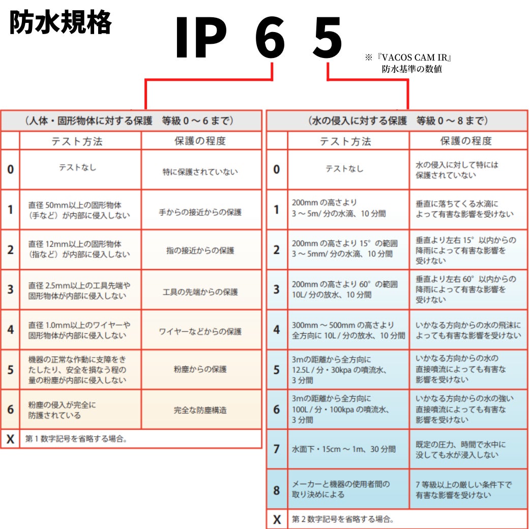 VACOS CAM IRは、防水防塵でその規格はIP65になります。