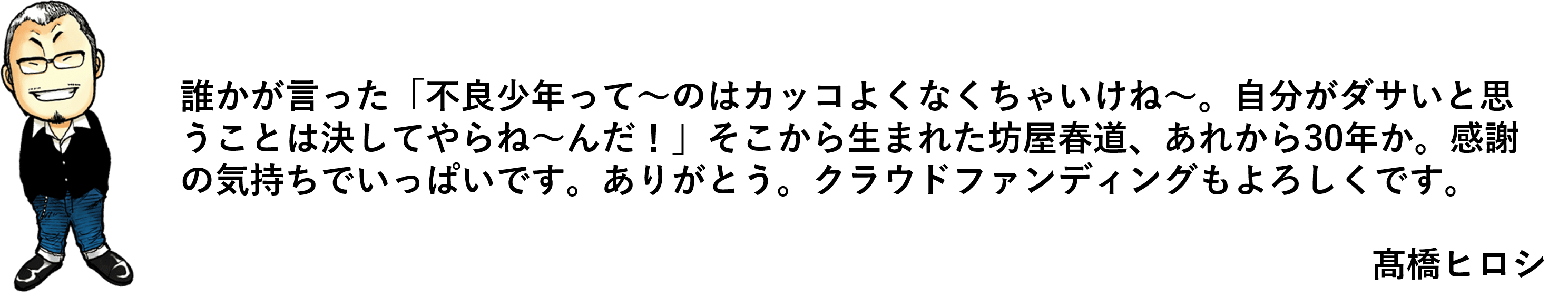 髙橋ヒロシ先生がこのプロジェクトのために描き起こした「春道イラスト」と共に、ご支援へのお礼のメッセージを送らせていただきます。