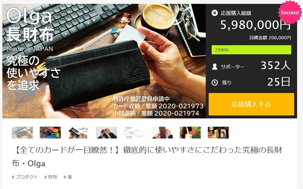 現在、Makuakeにて究極の長財布【Olga】のプロジェクトを実施しており、開始後一ヶ月程で600万にせまるご支援を頂戴しております。