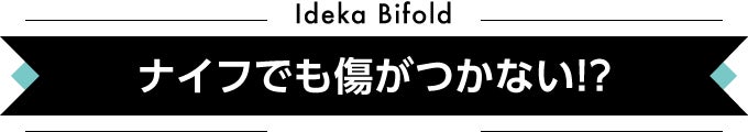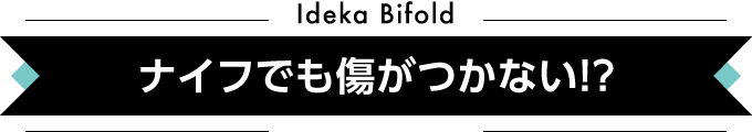 「Ideka 折りたたみミニ財布」の最大の特徴でもあった、圧倒的なタフさは健在。レザーに特殊加工を施しているため、ナイフでも傷がつくことはほとんどありません。